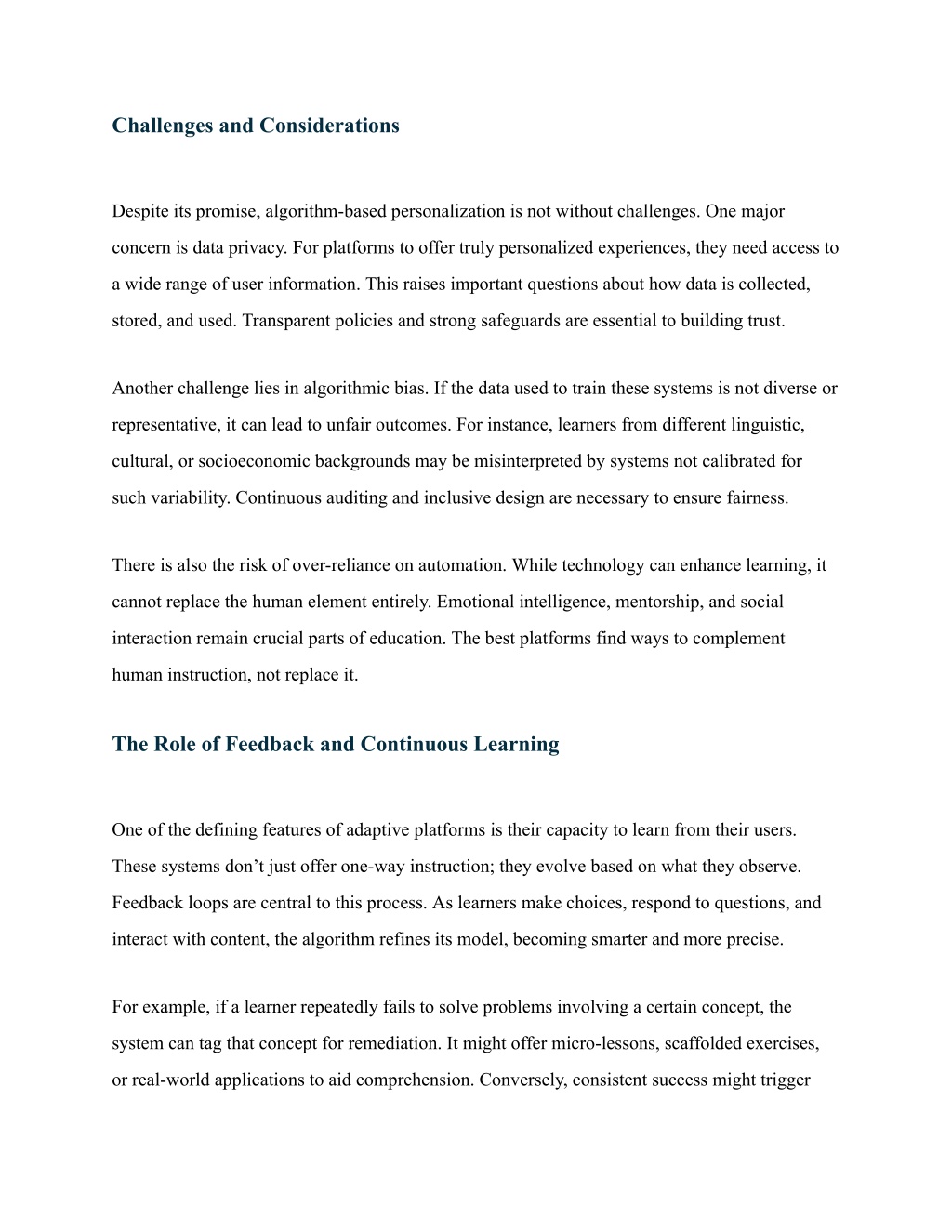 Challenges and Considerations Despite its promise, algorithm-based personalization is not without challenges. One major concern is data privacy. For platforms to offer truly personalized experiences, they need access to a wide range of user information. This raises important questions about how data is collected, stored, and used. Transparent policies and strong safeguards are essential to building trust. Another challenge lies in algorithmic bias. If the data used to train these systems is not diverse or representative, it can lead to unfair outcomes. For instance, learners from different linguistic, cultural, or socioeconomic backgrounds may be misinterpreted by systems not calibrated for such variability. Continuous auditing and inclusive design are necessary to ensure fairness. There is also the risk of over-reliance on automation. While technology can enhance learning, it cannot replace the human element entirely. Emotional intelligence, mentorship, and social interaction remain crucial parts of education. The best platforms find ways to complement human instruction, not replace it. The Role of Feedback and Continuous Learning One of the defining features of adaptive platforms is their capacity to learn from their users. These systems don’t just offer one-way instruction; they evolve based on what they observe. Feedback loops are central to this process. As learners make choices, respond to questions, and interact with content, the algorithm refines its model, becoming smarter and more precise. For example, if a learner repeatedly fails to solve problems involving a certain concept, the system can tag that concept for remediation. It might offer micro-lessons, scaffolded exercises, or real-world applications to aid comprehension. Conversely, consistent success might trigger