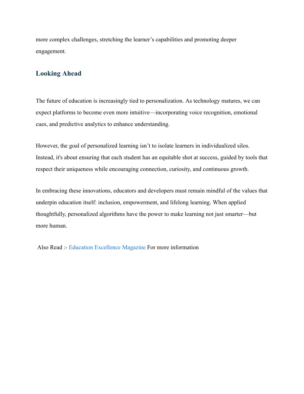 more complex challenges, stretching the learner’s capabilities and promoting deeper engagement. Looking Ahead The future of education is increasingly tied to personalization. As technology matures, we can expect platforms to become even more intuitive—incorporating voice recognition, emotional cues, and predictive analytics to enhance understanding. However, the goal of personalized learning isn’t to isolate learners in individualized silos. Instead, it's about ensuring that each student has an equitable shot at success, guided by tools that respect their uniqueness while encouraging connection, curiosity, and continuous growth. In embracing these innovations, educators and developers must remain mindful of the values that underpin education itself: inclusion, empowerment, and lifelong learning. When applied thoughtfully, personalized algorithms have the power to make learning not just smarter—but more human. Also Read :- Education Excellence Magazine For more information
