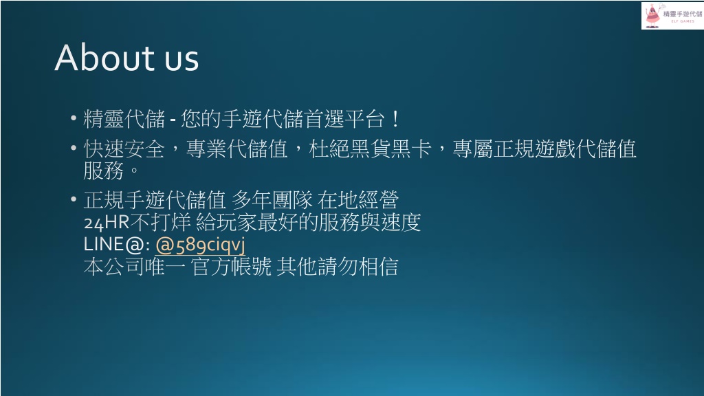 About us • 精靈代儲 - 您的手遊代儲首選平台! • 快速安全,專業代儲值,杜絕黑貨黑卡,專屬正規遊戲代儲值服務。 • 正規手遊代儲值 多年團隊 在地經營24HR不打烊 給玩家最好的服務與速度LINE@: @589ciqvj本公司唯一 官方帳號 其他請勿相信