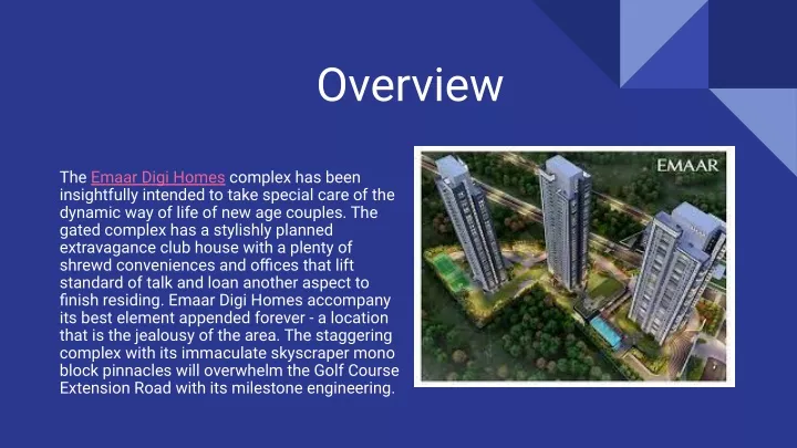 Overview The Emaar Digi Homes complex has been insightfully intended to take special care of the dynamic way of life of new age couples. The gated complex has a stylishly planned extravagance club house with a plenty of shrewd conveniences and offices that lift standard of talk and loan another aspect to finish residing. Emaar Digi Homes accompany its best element appended forever - a location that is the jealousy of the area. The staggering complex with its immaculate skyscraper mono block pinnacles will overwhelm the Golf Course Extension Road with its milestone engineering.