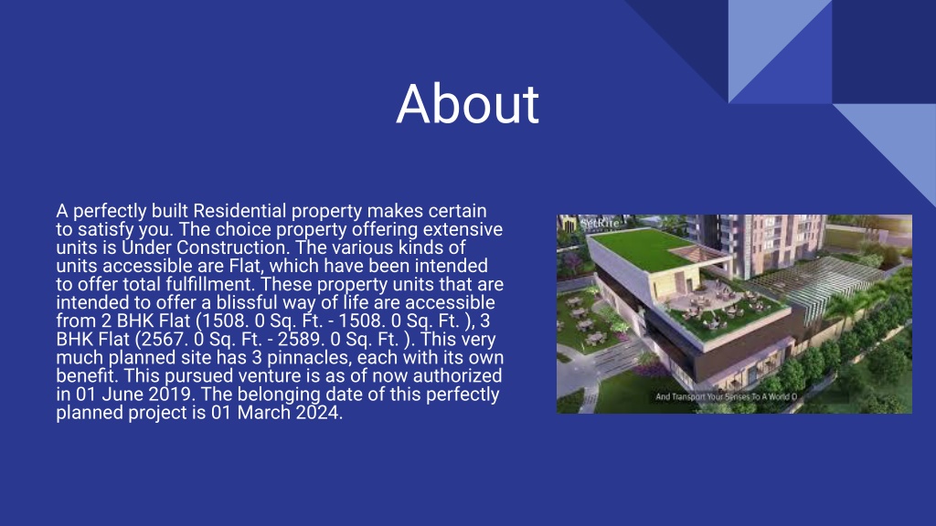 About A perfectly built Residential property makes certain to satisfy you. The choice property offering extensive units is Under Construction. The various kinds of units accessible are Flat, which have been intended to offer total fulfillment. These property units that are intended to offer a blissful way of life are accessible from 2 BHK Flat (1508. 0 Sq. Ft. - 1508. 0 Sq. Ft. ), 3 BHK Flat (2567. 0 Sq. Ft. - 2589. 0 Sq. Ft. ). This very much planned site has 3 pinnacles, each with its own benefit. This pursued venture is as of now authorized in 01 June 2019. The belonging date of this perfectly planned project is 01 March 2024.