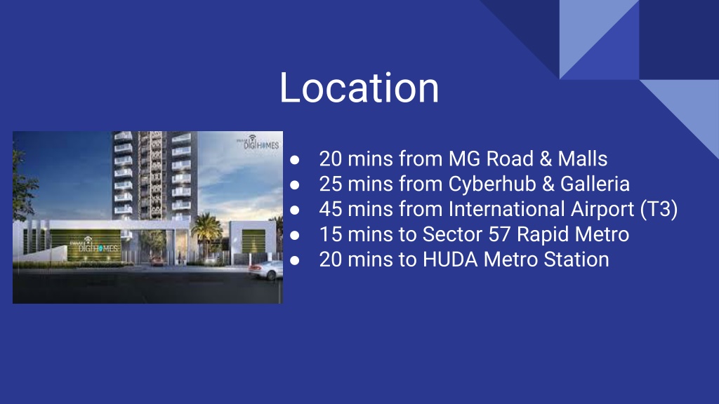 Location ● 20 mins from MG Road & Malls ● 25 mins from Cyberhub & Galleria ● 45 mins from International Airport (T3) ● 15 mins to Sector 57 Rapid Metro ● 20 mins to HUDA Metro Station