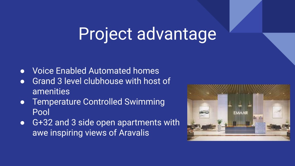Project advantage ● Voice Enabled Automated homes ● Grand 3 level clubhouse with host of amenities ● Temperature Controlled Swimming Pool ● G+32 and 3 side open apartments with awe inspiring views of Aravalis