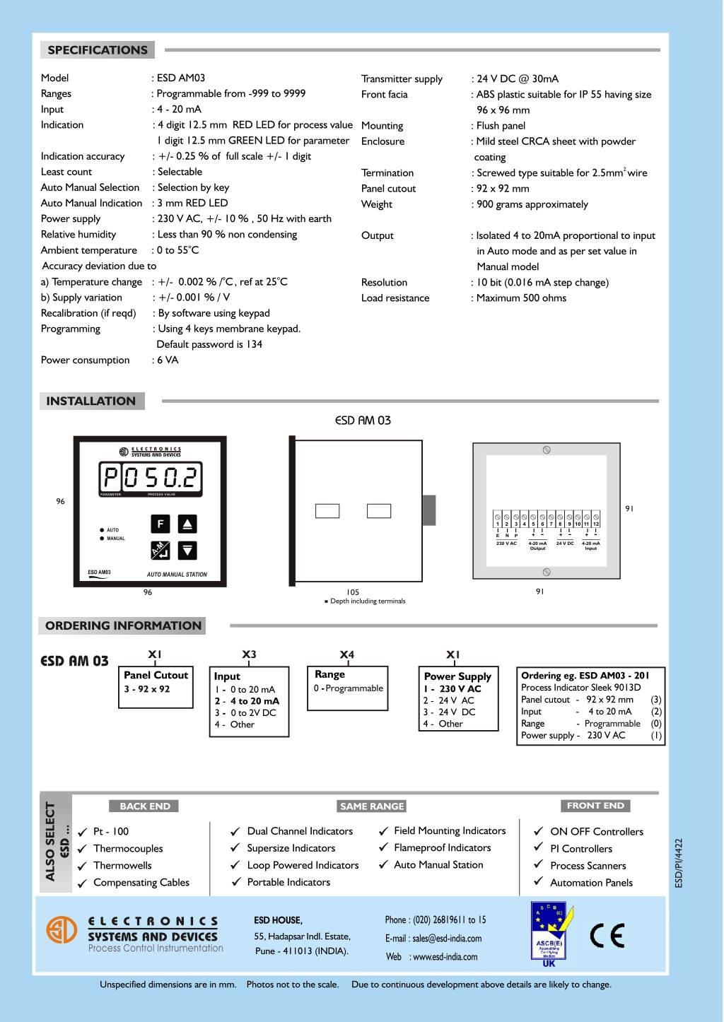SPECIFICATIONS Model : ESD AM03 Transmitter supply : 24 V DC @ 30mA Ranges : Programmable from -999 to 9999 Front facia : ABS plastic suitable for IP 55 having size Input : 4 - 20 mA 96 x 96 mm Indication : 4 digit 12.5 mm RED LED for process value Mounting : Flush panel 1 digit 12.5 mm GREEN LED for parameter Enclosure : Mild steel CRCA sheet with powder Indication accuracy : +/- 0.25 % of full scale +/- 1 digit coating 2 Least count : Selectable Termination : Screwed type suitable for 2.5mm wire Auto Manual Selection : Selection by key Panel cutout : 92 x 92 mm Auto Manual Indication : 3 mm RED LED Weight : 900 grams approximately Power supply : 230 V AC, +/- 10 % , 50 Hz with earth Relative humidity : Less than 90 % non condensing Output : Isolated 4 to 20mA proportional to input o Ambient temperature : 0 to 55 C in Auto mode and as per set value in Accuracy deviation due to Manual model o o a) Temperature change : +/- 0.002 % / C, ref at 25 C Resolution : 10 bit (0.016 mA step change) b) Supply variation : +/- 0.001 % / V Load resistance : Maximum 500 ohms Recalibration (if reqd) : By software using keypad Programming : Using 4 keys membrane keypad. Default password is 134 Power consumption : 6 VA INSTALLATION ESD AM 03 E L E C T R O N I C S SYSTEMS AND DEVICES P0502 . PROCESS VALUE PARAMETER 96 91 1 2 3 4 5 6 7 8 9 10 11 12 F AUTO - - - + + + N E P MANUAL 230 V AC 4-20 mA 24 V DC 4-20 mA M A- Output Input ESD AM03 AUTO MANUAL STATION 91 105 96 Depth including terminals ORDERING INFORMATION X1 X3 X4 X1 ESD AM 03 Range Panel Cutout Ordering eg. ESD AM03 - 201 Input Power Supply Process Indicator Sleek 9013D Programmable 0 - 1 - 230 V AC 3 - 92 x 92 1 - 0 to 20 mA Panel cutout - 92 x 92 mm (3) 2 - 24 V AC 2 - 4 to 20 mA Input - 4 to 20 mA (2) 3 - 24 V DC 3 - 0 to 2V DC Range - Programmable (0) 4 - Other 4 - Other Power supply - 230 V AC (1) ALSO SELECT FRONT END BACK END SAME RANGE ESD ... Field Mounting Indicators Dual Channel Indicators Pt - 100 ON OFF Controllers ESD/PI/4422 Flameproof Indicators Supersize Indicators Thermocouples PI Controllers Auto Manual Station Loop Powered Indicators Thermowells Process Scanners Portable Indicators Compensating Cables Automation Panels Phone : (020) 26819611 to 15 ESD HOUSE, E L E C T R O N I C S 55, Hadapsar Indl. Estate, SYSTEMS AND DEVICES E-mail : sales@esd-india.com Process Control Instrumentation Pune - 411013 (INDIA). Web : www.esd-india.com Unspecified dimensions are in mm. Photos not to the scale. Due to continuous development above details are likely to change.