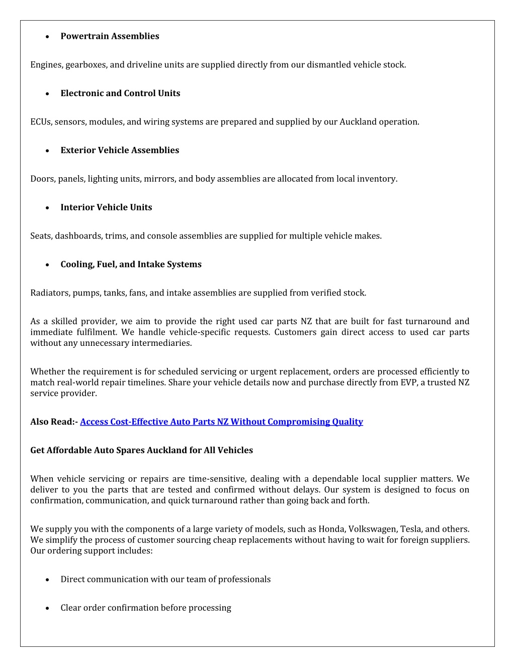 Powertrain Assemblies Engines, gearboxes, and driveline units are supplied directly from our dismantled vehicle stock. Electronic and Control Units ECUs, sensors, modules, and wiring systems are prepared and supplied by our Auckland operation. Exterior Vehicle Assemblies Doors, panels, lighting units, mirrors, and body assemblies are allocated from local inventory. Interior Vehicle Units Seats, dashboards, trims, and console assemblies are supplied for multiple vehicle makes. Cooling, Fuel, and Intake Systems Radiators, pumps, tanks, fans, and intake assemblies are supplied from verified stock. As a skilled provider, we aim to provide the right used car parts NZ that are built for fast turnaround and immediate fulfilment. We handle vehicle-specific requests. Customers gain direct access to used car parts without any unnecessary intermediaries. Whether the requirement is for scheduled servicing or urgent replacement, orders are processed efficiently to match real-world repair timelines. Share your vehicle details now and purchase directly from EVP, a trusted NZ service provider. Also Read:- Access Cost-Effective Auto Parts NZ Without Compromising Quality Get Affordable Auto Spares Auckland for All Vehicles When vehicle servicing or repairs are time-sensitive, dealing with a dependable local supplier matters. We deliver to you the parts that are tested and confirmed without delays. Our system is designed to focus on confirmation, communication, and quick turnaround rather than going back and forth. We supply you with the components of a large variety of models, such as Honda, Volkswagen, Tesla, and others. We simplify the process of customer sourcing cheap replacements without having to wait for foreign suppliers. Our ordering support includes: Direct communication with our team of professionals Clear order confirmation before processing