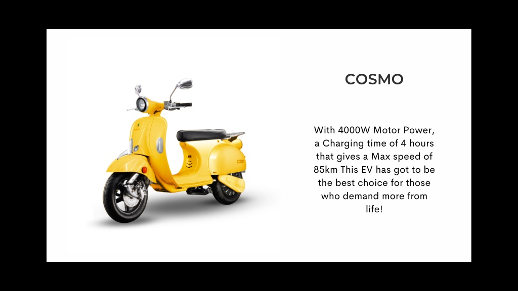 COSMO With 4000W Motor Power, a Charging time of 4 hours that gives a Max speed of 85km This EV has got to be the best choice for those who demand more from life!