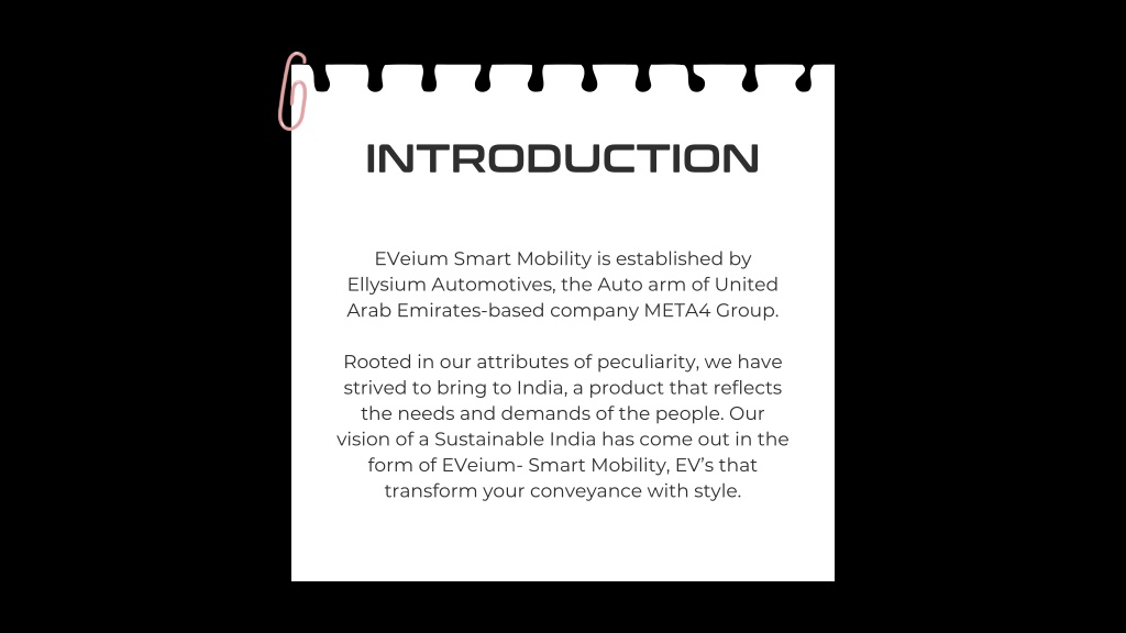 INTRODUCTION EVeium Smart Mobility is established by Ellysium Automotives, the Auto arm of United Arab Emirates-based company META4 Group. Rooted in our attributes of peculiarity, we have strived to bring to India, a product that reflects the needs and demands of the people. Our vision of a Sustainable India has come out in the form of EVeium- Smart Mobility, EV’s that transform your conveyance with style.