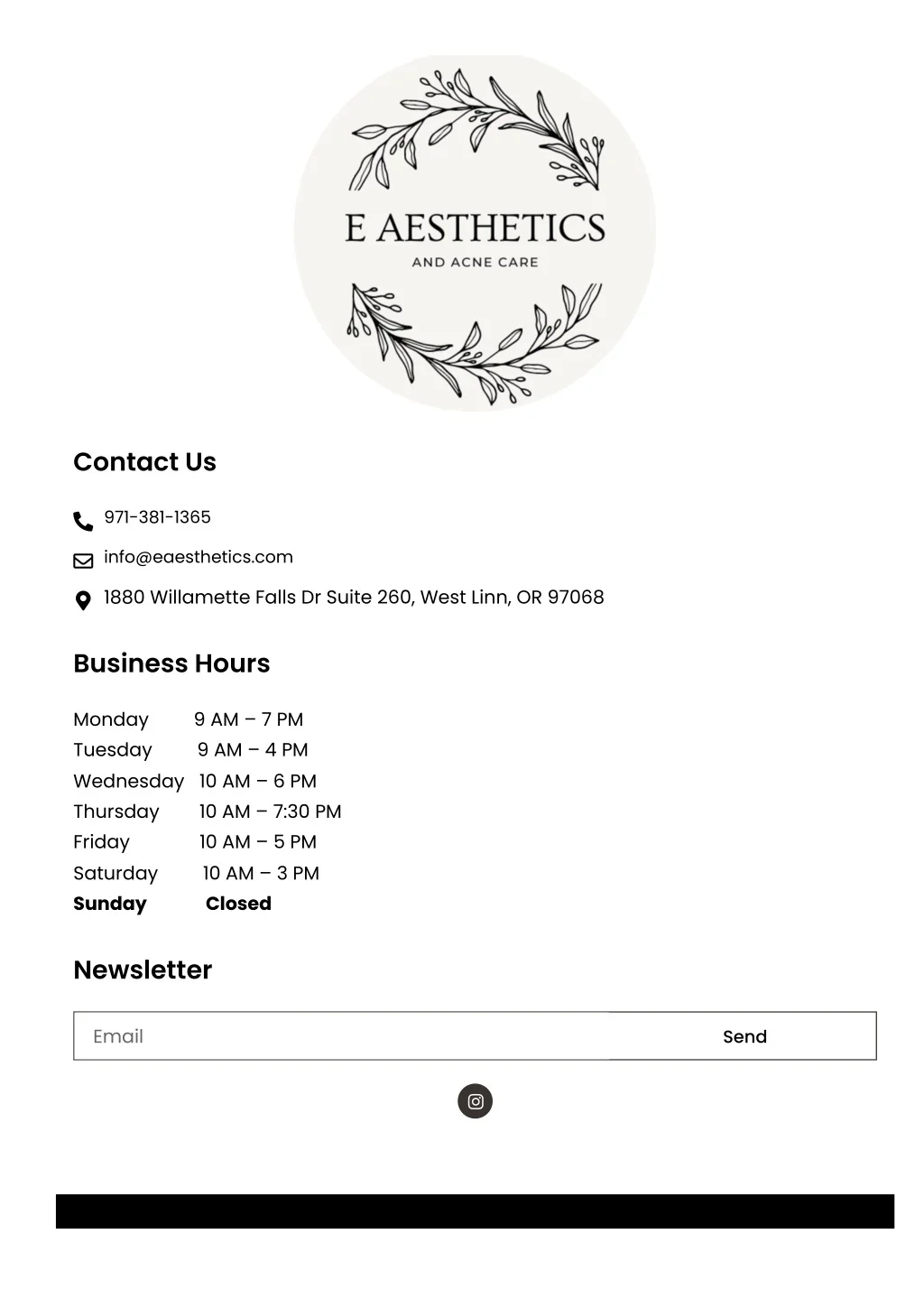 Contact Us 971-381-1365 info@eaesthetics.com 1880 Willamette Falls Dr Suite 260, West Linn, OR 97068 Business Hours Monday 9 AM – 7 PM Tuesday 9 AM – 4 PM Wednesday 10 AM – 6 PM Thursday 10 AM – 7:30 PM Friday 10 AM – 5 PM Saturday 10 AM – 3 PM Sunday Closed Newsletter Email Send