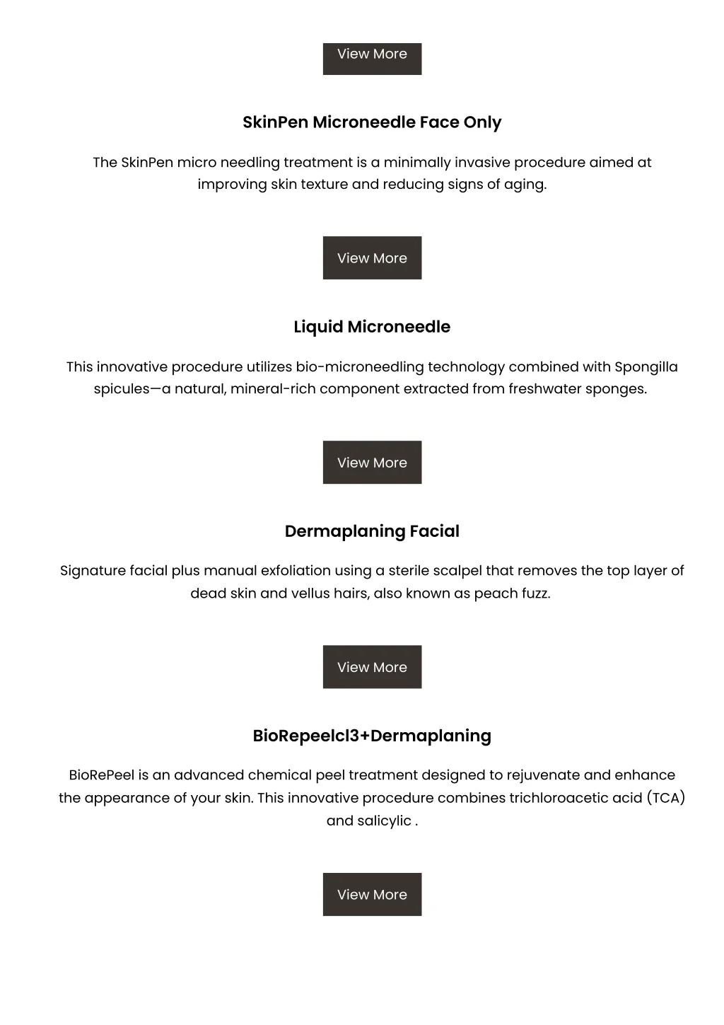 View More SkinPen Microneedle Face Only The SkinPen micro needling treatment is a minimally invasive procedure aimed at improving skin texture and reducing signs of aging. View More Liquid Microneedle This innovative procedure utilizes bio-microneedling technology combined with Spongilla spicules—a natural, mineral-rich component extracted from freshwater sponges. View More Dermaplaning Facial Signature facial plus manual exfoliation using a sterile scalpel that removes the top layer of dead skin and vellus hairs, also known as peach fuzz. View More BioRepeelcl3+Dermaplaning BioRePeel is an advanced chemical peel treatment designed to rejuvenate and enhance the appearance of your skin. This innovative procedure combines trichloroacetic acid (TCA) and salicylic . View More