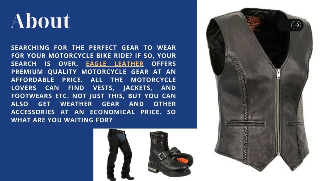 About SEARCHING FOR THE PERFECT GEAR TO WEAR FOR YOUR MOTORCYCLE BIKE RIDE? IF SO, YOUR SEARCH IS OVER. EAGLE PREMIUM QUALITY MOTORCYCLE GEAR AT AN AFFORDABLE PRICE. ALL LOVERS CAN FIND VESTS, FOOTWEARS ETC. NOT JUST THIS, BUT YOU CAN ALSO GET WEATHER ACCESSORIES AT AN ECONOMICAL PRICE. SO WHAT ARE YOU WAITING FOR? LEATHER OFFERS THE MOTORCYCLE JACKETS, AND GEAR AND OTHER
