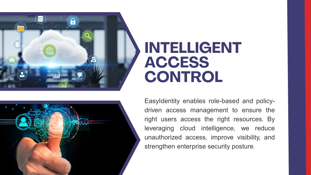4. INTELLIGENT ACCESS CONTROL EasyIdentity enables role-based and policy- driven access management to ensure the right users access the right resources. By leveraging cloud intelligence, we reduce unauthorized access, improve visibility, and strengthen enterprise security posture.