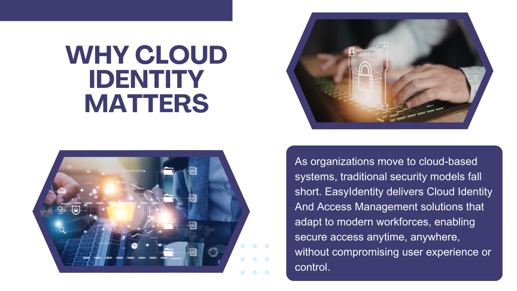 3. WHY CLOUD IDENTITY MATTERS As organizations move to cloud-based systems, traditional security models fall short. EasyIdentity delivers Cloud Identity And Access Management solutions that adapt to modern workforces, enabling secure access anytime, anywhere, without compromising user experience or control.