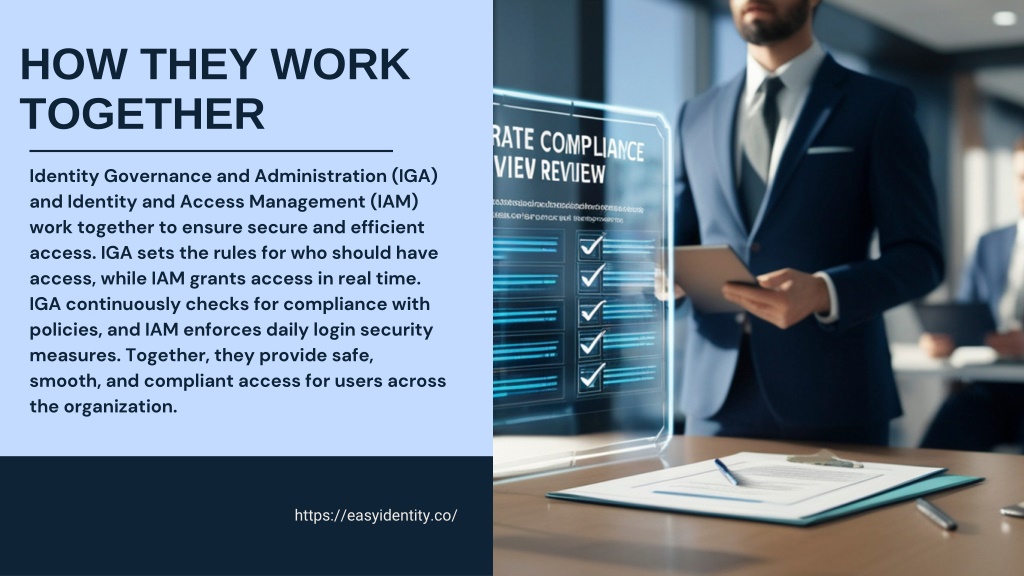 HOW THEY WORK TOGETHER Identity Governance and Administration (IGA) and Identity and Access Management (IAM) work together to ensure secure and efficient access. IGA sets the rules for who should have access, while IAM grants access in real time. IGA continuously checks for compliance with policies, and IAM enforces daily login security measures. Together, they provide safe, smooth, and compliant access for users across the organization. https://easyidentity.co/