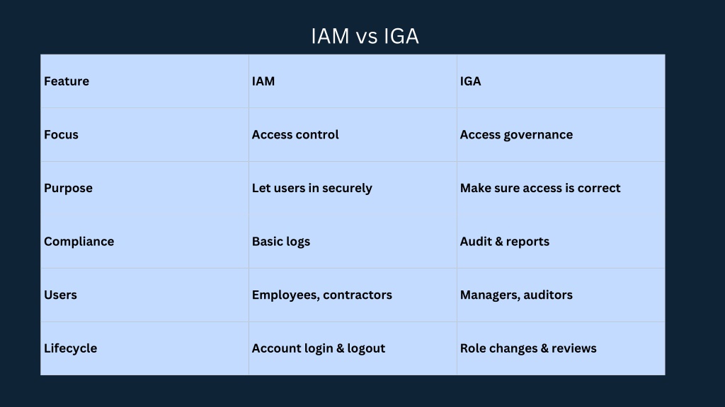IAM vs IGA Feature IAM IGA Focus Access control Access governance Purpose Let users in securely Make sure access is correct Compliance Basic logs Audit & reports Users Employees, contractors Managers, auditors Lifecycle Account login & logout Role changes & reviews