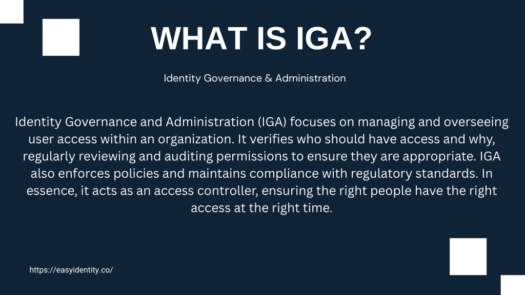 WHAT IS IGA? Identity Governance & Administration Identity Governance and Administration (IGA) focuses on managing and overseeing user access within an organization. It verifies who should have access and why, regularly reviewing and auditing permissions to ensure they are appropriate. IGA also enforces policies and maintains compliance with regulatory standards. In essence, it acts as an access controller, ensuring the right people have the right access at the right time. https://easyidentity.co/