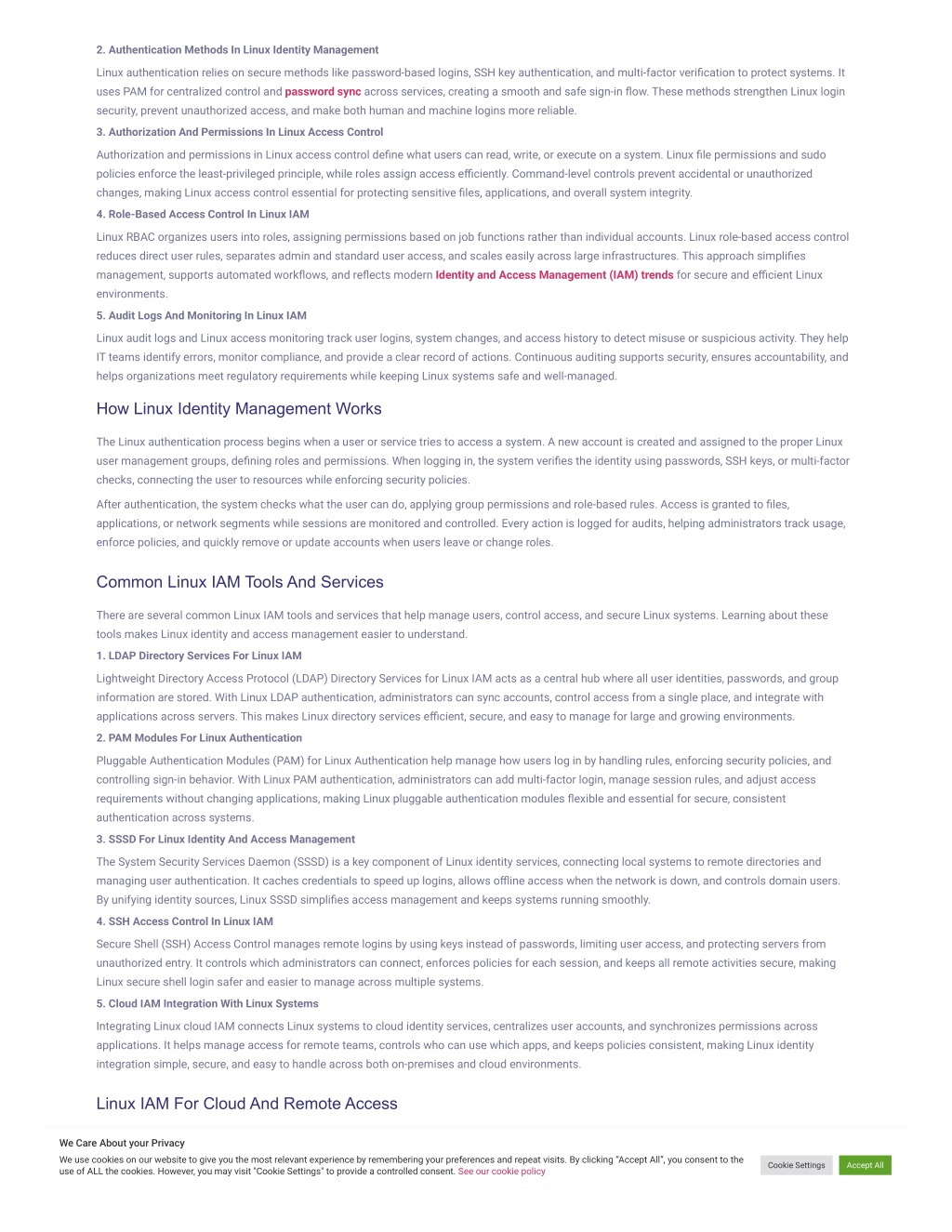 2. Authentication Methods In Linux Identity Management Linux authentication relies on secure methods like password-based logins, SSH key authentication, and multi-factor veri?cation to protect systems. It uses PAM for centralized control and password sync across services, creating a smooth and safe sign-in ?ow. These methods strengthen Linux login security, prevent unauthorized access, and make both human and machine logins more reliable. 3. Authorization And Permissions In Linux Access Control Authorization and permissions in Linux access control de?ne what users can read, write, or execute on a system. Linux ?le permissions and sudo policies enforce the least-privileged principle, while roles assign access e?ciently. Command-level controls prevent accidental or unauthorized changes, making Linux access control essential for protecting sensitive ?les, applications, and overall system integrity. 4. Role-Based Access Control In Linux IAM Linux RBAC organizes users into roles, assigning permissions based on job functions rather than individual accounts. Linux role-based access control reduces direct user rules, separates admin and standard user access, and scales easily across large infrastructures. This approach simpli?es management, supports automated work?ows, and re?ects modern Identity and Access Management (IAM) trends for secure and e?cient Linux environments. 5. Audit Logs And Monitoring In Linux IAM Linux audit logs and Linux access monitoring track user logins, system changes, and access history to detect misuse or suspicious activity. They help IT teams identify errors, monitor compliance, and provide a clear record of actions. Continuous auditing supports security, ensures accountability, and helps organizations meet regulatory requirements while keeping Linux systems safe and well-managed. How Linux Identity Management Works The Linux authentication process begins when a user or service tries to access a system. A new account is created and assigned to the proper Linux user management groups, de?ning roles and permissions. When logging in, the system veri?es the identity using passwords, SSH keys, or multi-factor checks, connecting the user to resources while enforcing security policies. After authentication, the system checks what the user can do, applying group permissions and role-based rules. Access is granted to ?les, applications, or network segments while sessions are monitored and controlled. Every action is logged for audits, helping administrators track usage, enforce policies, and quickly remove or update accounts when users leave or change roles. Common Linux IAM Tools And Services There are several common Linux IAM tools and services that help manage users, control access, and secure Linux systems. Learning about these tools makes Linux identity and access management easier to understand. 1. LDAP Directory Services For Linux IAM Lightweight Directory Access Protocol (LDAP) Directory Services for Linux IAM acts as a central hub where all user identities, passwords, and group information are stored. With Linux LDAP authentication, administrators can sync accounts, control access from a single place, and integrate with applications across servers. This makes Linux directory services e?cient, secure, and easy to manage for large and growing environments. 2. PAM Modules For Linux Authentication Pluggable Authentication Modules (PAM) for Linux Authentication help manage how users log in by handling rules, enforcing security policies, and controlling sign-in behavior. With Linux PAM authentication, administrators can add multi-factor login, manage session rules, and adjust access requirements without changing applications, making Linux pluggable authentication modules ?exible and essential for secure, consistent authentication across systems. 3. SSSD For Linux Identity And Access Management The System Security Services Daemon (SSSD) is a key component of Linux identity services, connecting local systems to remote directories and managing user authentication. It caches credentials to speed up logins, allows o?ine access when the network is down, and controls domain users. By unifying identity sources, Linux SSSD simpli?es access management and keeps systems running smoothly. 4. SSH Access Control In Linux IAM Secure Shell (SSH) Access Control manages remote logins by using keys instead of passwords, limiting user access, and protecting servers from unauthorized entry. It controls which administrators can connect, enforces policies for each session, and keeps all remote activities secure, making Linux secure shell login safer and easier to manage across multiple systems. 5. Cloud IAM Integration With Linux Systems Integrating Linux cloud IAM connects Linux systems to cloud identity services, centralizes user accounts, and synchronizes permissions across applications. It helps manage access for remote teams, controls who can use which apps, and keeps policies consistent, making Linux identity integration simple, secure, and easy to handle across both on-premises and cloud environments. Linux IAM For Cloud And Remote Access Linux IAM for Cloud and Remote Access manages how users and services log into cloud servers and remote systems. By using centralized identity We Care About your Privacy systems, organizations can control who can access which applications, track user logins, and provide consistent permissions for distributed teams We use cookies on our website to give you the most relevant experience by remembering your preferences and repeat visits. By clicking “Accept All”, you consent to the use of ALL the cookies. However, you may visit "Cookie Settings" to provide a controlled consent. See our cookie policy Cookie Settings Accept All across multiple environments. This makes access safer and easier to manage.
