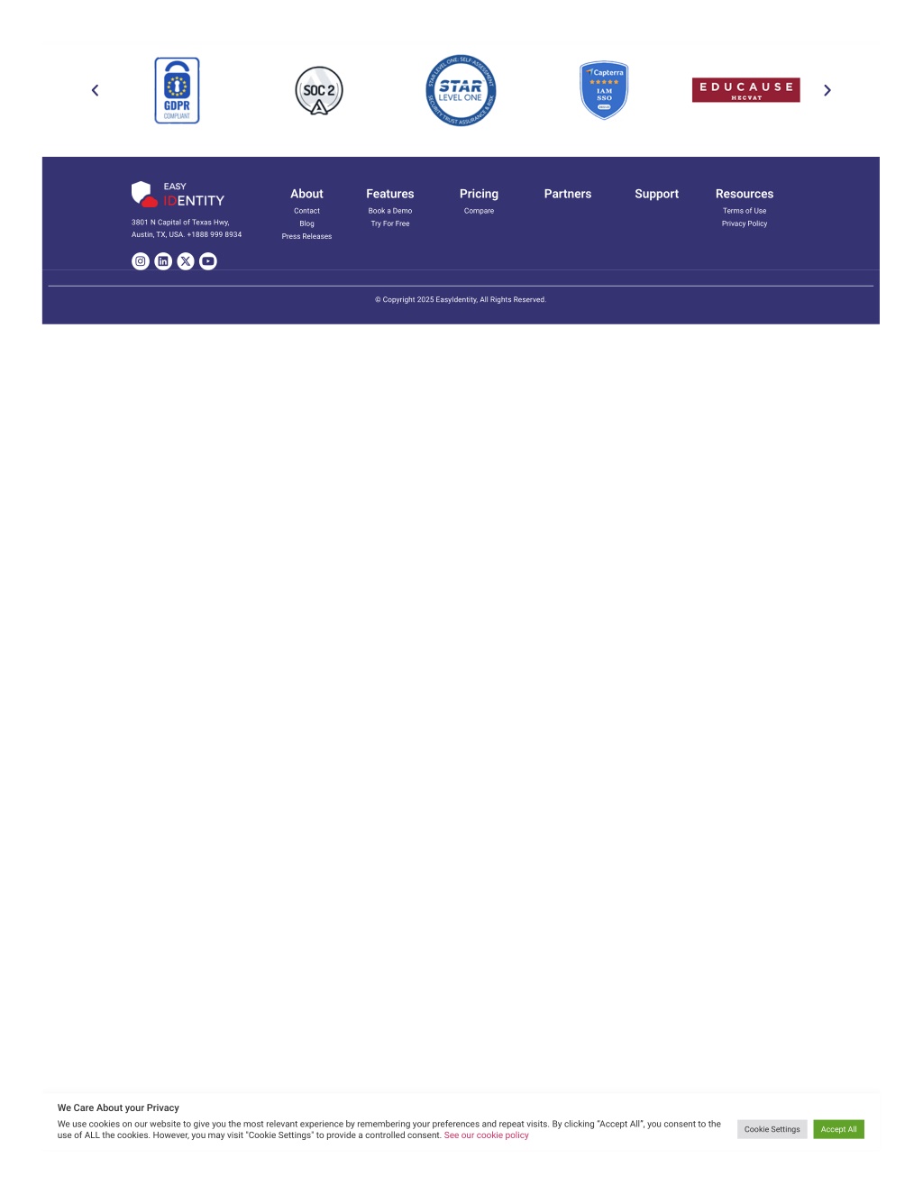 About Features Pricing Partners Support Resources Contact Book a Demo Compare Terms of Use 3801 N Capital of Texas Hwy, Blog Try For Free Privacy Policy Austin, TX, USA. +1888 999 8934 Press Releases © Copyright 2025 EasyIdentity, All Rights Reserved. We Care About your Privacy We use cookies on our website to give you the most relevant experience by remembering your preferences and repeat visits. By clicking “Accept All”, you consent to the use of ALL the cookies. However, you may visit "Cookie Settings" to provide a controlled consent. See our cookie policy Cookie Settings Accept All