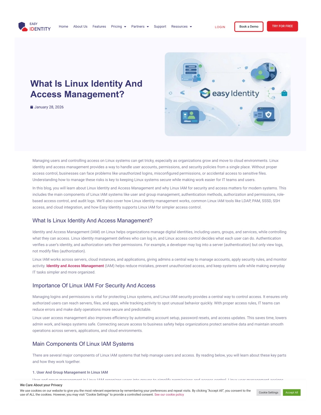 TRY FOR FREE Pricing Partners Resources Home About Us Features Support Book a Demo LOGIN What Is Linux Identity And Access Management? January 28, 2026 Managing users and controlling access on Linux systems can get tricky, especially as organizations grow and move to cloud environments. Linux identity and access management provides a way to handle user accounts, permissions, and security policies from a single place. Without proper access control, businesses can face problems like unauthorized logins, miscon?gured permissions, or accidental access to sensitive ?les. Understanding how to manage these risks is key to keeping Linux systems secure while making work easier for IT teams and users. In this blog, you will learn about Linux Identity and Access Management and why Linux IAM for security and access matters for modern systems. This includes the main components of Linux IAM systems like user and group management, authentication methods, authorization and permissions, role- based access control, and audit logs. We’ll also cover how Linux identity management works, common Linux IAM tools like LDAP, PAM, SSSD, SSH access, and cloud integration, and how Easy Identity supports Linux IAM for simpler access control. What Is Linux Identity And Access Management? Identity and Access Management (IAM) on Linux helps organizations manage digital identities, including users, groups, and services, while controlling what they can access. Linux identity management de?nes who can log in, and Linux access control decides what each user can do. Authentication veri?es a user’s identity, and authorization sets their permissions. For example, a developer may log into a server (authentication) but only view logs, not modify ?les (authorization). Linux IAM works across servers, cloud instances, and applications, giving admins a central way to manage accounts, apply security rules, and monitor activity. Identity and Access Management (IAM) helps reduce mistakes, prevent unauthorized access, and keep systems safe while making everyday IT tasks simpler and more organized. Importance Of Linux IAM For Security And Access Managing logins and permissions is vital for protecting Linux systems, and Linux IAM security provides a central way to control access. It ensures only authorized users can reach servers, ?les, and apps, while tracking activity to spot unusual behavior quickly. With proper access rules, IT teams can reduce errors and make daily operations more secure and predictable. Linux user access management also improves e?ciency by automating account setup, password resets, and access updates. This saves time, lowers admin work, and keeps systems safe. Connecting secure access to business safety helps organizations protect sensitive data and maintain smooth operations across servers, applications, and cloud environments. Main Components Of Linux IAM Systems There are several major components of Linux IAM systems that help manage users and access. By reading below, you will learn about these key parts and how they work together. 1. User And Group Management In Linux IAM User and group management in Linux IAM organizes users into groups to simplify permissions and access control. Linux user management assigns We Care About your Privacy roles to individuals, while Linux group management applies shared permissions to multiple users. This separation of access supports both local and We use cookies on our website to give you the most relevant experience by remembering your preferences and repeat visits. By clicking “Accept All”, you consent to the use of ALL the cookies. However, you may visit "Cookie Settings" to provide a controlled consent. See our cookie policy centralized accounts, covering the full lifecycle of adding, updating, or deleting users and groups e?ciently. Cookie Settings Accept All
