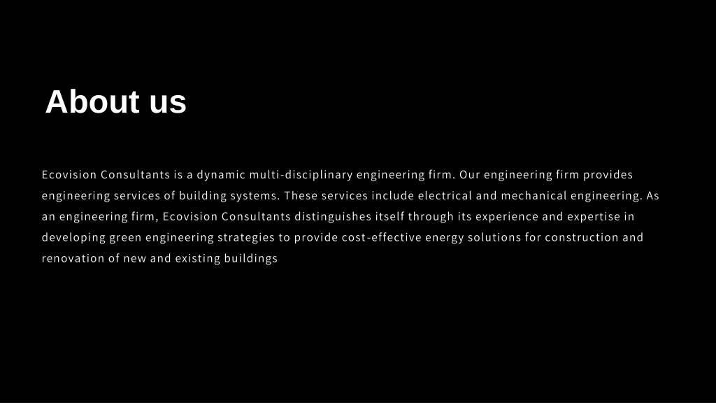About us Ecovision Consultants is a dynamic multi-disciplinary engineering firm. Our engineering firm provides engineering services of building systems. These services include electrical and mechanical engineering. As an engineering firm, Ecovision Consultants distinguishes itself through its experience and expertise in developing green engineering strategies to provide cost-effective energy solutions for construction and renovation of new and existing buildings