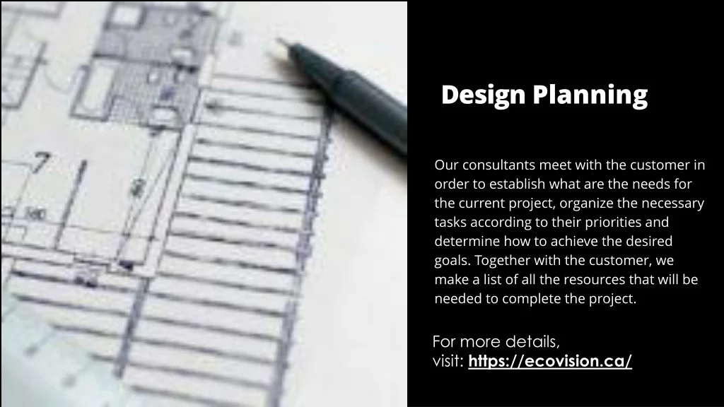 Design Planning Our consultants meet with the customer in order to establish what are the needs for the current project, organize the necessary tasks according to their priorities and determine how to achieve the desired goals. Together with the customer, we make a list of all the resources that will be needed to complete the project. For more details, visit: https://ecovision.ca/