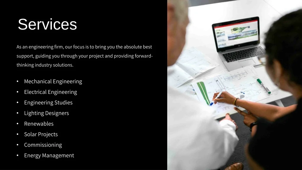 Services As an engineering firm, our focus is to bring you the absolute best support, guiding you through your project and providing forward-thinking industry solutions. • Mechanical Engineering • Electrical Engineering • Engineering Studies • Lighting Designers • Renewables • Solar Projects • Commissioning • Energy Management