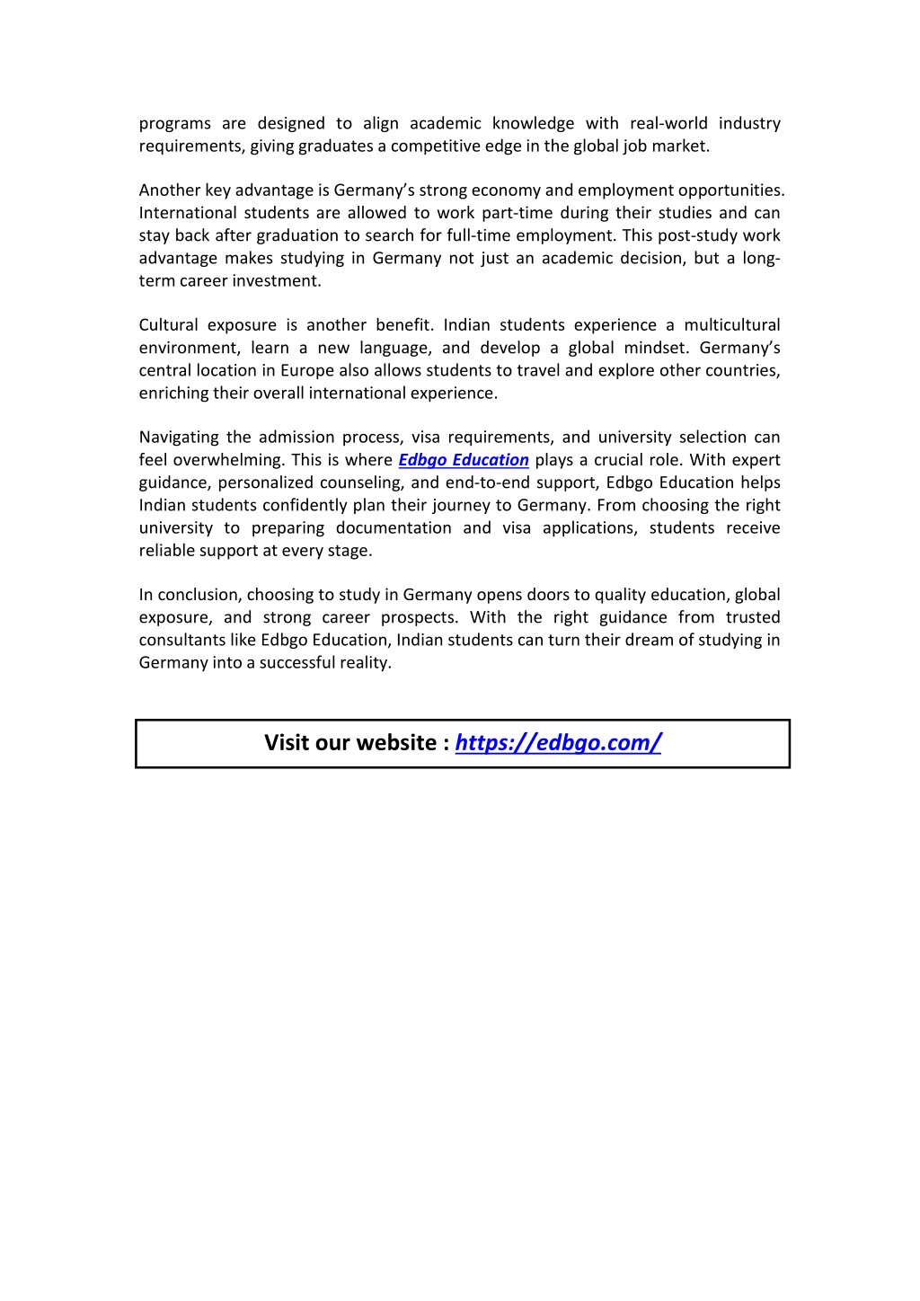 2. programs are designed to align academic knowledge with real-world industry requirements, giving graduates a competitive edge in the global job market. Another key advantage is Germany’s strong economy and employment opportunities. International students are allowed to work part-time during their studies and can stay back after graduation to search for full-time employment. This post-study work advantage makes studying in Germany not just an academic decision, but a long- term career investment. Cultural exposure is another benefit. Indian students experience a multicultural environment, learn a new language, and develop a global mindset. Germany’s central location in Europe also allows students to travel and explore other countries, enriching their overall international experience. Navigating the admission process, visa requirements, and university selection can feel overwhelming. This is where Edbgo Education plays a crucial role. With expert guidance, personalized counseling, and end-to-end support, Edbgo Education helps Indian students confidently plan their journey to Germany. From choosing the right university to preparing documentation and visa applications, students receive reliable support at every stage. In conclusion, choosing to study in Germany opens doors to quality education, global exposure, and strong career prospects. With the right guidance from trusted consultants like Edbgo Education, Indian students can turn their dream of studying in Germany into a successful reality. Visit our website : https://edbgo.com/