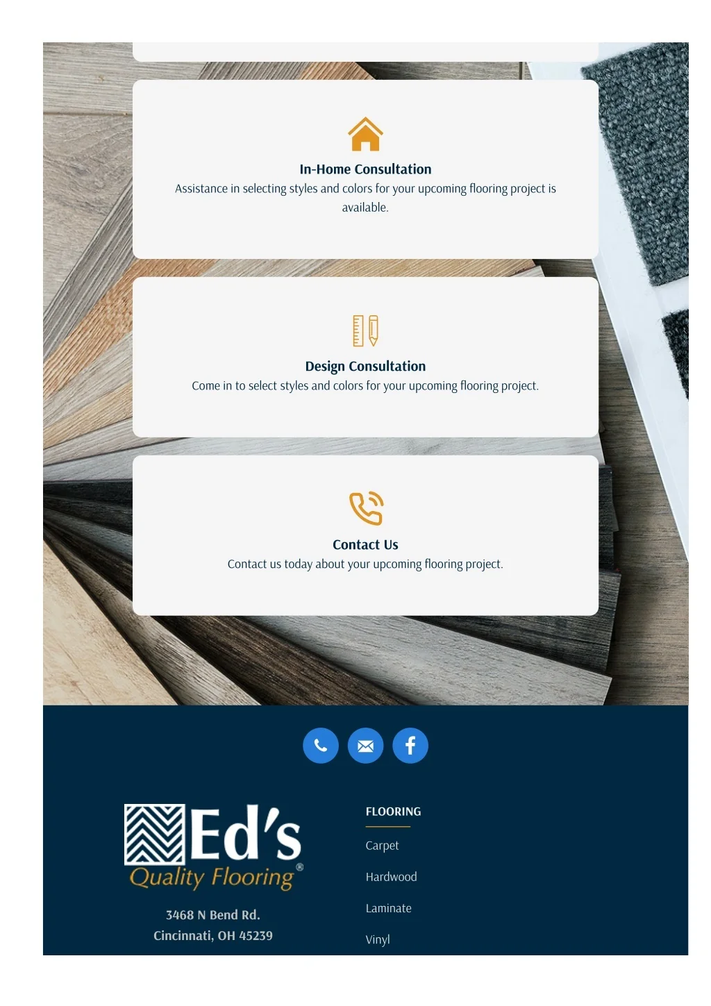 In-Home Consultation Assistance in selecting styles and colors for your upcoming ?ooring project is available. Design Consultation Come in to select styles and colors for your upcoming ?ooring project. Contact Us Contact us today about your upcoming ?ooring project. FLOORING Carpet Hardwood Laminate 3468 N Bend Rd. Cincinnati, OH 45239 Vinyl