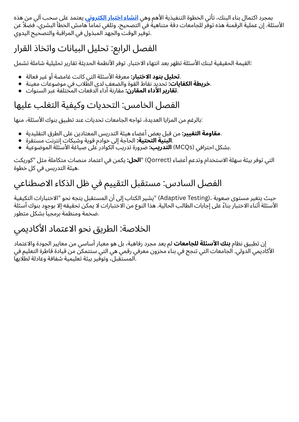 هﺬﻫﻦﻣﻲﻟآﺐﺤﺳﲆﻋﺪﻤﺘﻌﻳ ﻦﻋًﻼﻀﻓ،يﺮﺸﺒﻟاﺄﻄﺨﻟاﺶﻣﺎﻫًﺎﻣﺎﻤﺗﻲﻐﻠﺗو،ﺢﻴﺤﺼﺘﻟاﻲﻓﺔﻴﻫﺎﻨﺘﻣﺔﻗدتﺎﻌﻣﺎﺠﻠﻟﺮﻓﻮﺗهﺬﻫﺔﻨﻤﻗﺮﻟاﺔﻴﻠﻤﻋنإ .ﺔﻠﺌﺳﻷا يوﺪﻴﻟاﺢﻴﺤﺼﺘﻟاوﺔﺒﻗاﺮﻤﻟاﻲﻓلوﺬﺒﻤﻟاﺪﻬﺠﻟاوﺖﻗﻮﻟاﺮﻴﻓﻮﺗ. راﺮﻘﻟاذﺎﺨﺗاوتﺎﻧﺎﻴﺒﻟاﻞﻴﻠﺤﺗ :ﻊﺑاﺮﻟاﻞﺼﻔﻟا ﻞﻤﺸﺗﺔﻠﻣﺎﺷﺔﻴﻠﻴﻠﺤﺗﺮﻳرﺎﻘﺗﺔﺜﻳﺪﺤﻟاﺔﻤﻈﻧﻷاﺮﻓﻮﺗ .رﺎﺒﺘﺧﻻاءﺎﻬﺘﻧاﺪﻌﺑﺮﻬﻈﺗﺔﻠﺌﺳﻷاﻚﻨﺒﻟﺔﻴﻘﻴﻘﺤﻟاﺔﻤﻴﻘﻟا: :رﺎﺒﺘﺧﻻادﻮﻨﺑﻞﻴﻠﺤﺗ ﺔﻨﻴﻌﻣتﺎﻋﻮﺿﻮﻣﻲﻓبﻼﻄﻟاىﺪﻟﻒﻌﻀﻟاوةﻮﻘﻟاطﺎﻘﻧﺪﻳﺪﺤﺗ :نرﺎﻘﻤﻟاءادﻷاﺮﻳرﺎﻘﺗ ﺎﻬﻴﻠﻋﺐﻠﻐﺘﻟاﺔﻴﻔﻴﻛوتﺎﻳﺪﺤﺘﻟا :ﺲﻣﺎﺨﻟاﻞﺼﻔﻟا ﺎﻬﻨﻣ،ﺔﻠﺌﺳﻷاكﻮﻨﺑﻖﻴﺒﻄﺗﺪﻨﻋتﺎﻳﺪﺤﺗتﺎﻌﻣﺎﺠﻟاﻪﺟاﻮﺗ،ةﺪﻳﺪﻌﻟاﺎﻳاﺰﻤﻟاﻦﻣﻢﻏﺮﻟﺎﺑ: ﺔﻳﺪﻴﻠﻘﺘﻟاقﺮﻄﻟاﲆﻋﻦﻳدﺎﺘﻌﻤﻟاﺲﻳرﺪﺘﻟاﺔﺌﻴﻫءﺎﻀﻋأﺾﻌﺑﻞﺒﻗﻦﻣ :ﺔﻴﺘﺤﺘﻟاﺔﻴﻨﺒﻟا :ﺐﻳرﺪﺘﻟا :ﻞﺤﻟا ةﻮﻄﺧﻞﻛﻲﻓﺲﻳرﺪﺘﻟاﺔﺌﻴﻫ. ﻲﻋﺎﻨﻄﺻﻻاءﺎﻛﺬﻟاﻞﻇﻲﻓﻢﻴﻴﻘﺘﻟاﻞﺒﻘﺘﺴﻣ :سدﺎﺴﻟاﻞﺼﻔﻟا ﺔﻴﻔﻴﻜﺘﻟاتارﺎﺒﺘﺧﻻا" ﻮﺤﻧﻪﺠﺘﻳﻞﺒﻘﺘﺴﻤﻟانأﱃإبﺎﺘﻜﻟاﺮﻴﺸﻳ" (Adaptive Testing)،ﺔﺑﻮﻌﺻىﻮﺘﺴﻣﺮﻴﻐﺘﻳﺚﻴﺣ ﺔﻠﺌﺳأكﻮﻨﺑدﻮﺟﻮﺑﻻإﻪﻘﻴﻘﺤﺗﻦﻜﻤﻳﻻتارﺎﺒﺘﺧﻻاﻦﻣعﻮﻨﻟااﺬﻫ .ﺔﻴﻟﺎﺤﻟاﺐﻟﺎﻄﻟاتﺎﺑﺎﺟإﲆﻋًءﺎﻨﺑرﺎﺒﺘﺧﻻاءﺎﻨﺛأﺔﻠﺌﺳﻷا رﻮﻄﺘﻣﻞﻜﺸﺑًﺎﻴﺠﻣﺮﺑﺔﻤﻈﻨﻣوﺔﻤﺨﺿ. ﻲﻤﻳدﺎﻛﻷادﺎﻤﺘﻋﻻاﻮﺤﻧﻖﻳﺮﻄﻟا :ﺔﺻﻼﺨﻟا دﺎﻤﺘﻋﻻاوةدﻮﺠﻟاﺮﻴﻳﺎﻌﻣﻦﻣﻲﺳﺎﺳأرﺎﻴﻌﻣﻮﻫﻞﺑ،ﺔﻴﻫﺎﻓردﺮﺠﻣﺪﻌﻳﻢﻟ ﻲﻓﻢﻴﻠﻌﺘﻟاةﺮﻃﺎﻗةدﺎﻴﻗﻦﻣﻦﻜﻤﺘﺘﺳﻲﺘﻟاﻲﻫﻲﻤﻗرﻲﻓﺮﻌﻣنوﺰﺨﻣءﺎﻨﺑﻲﻓﺢﺠﻨﺗﻲﺘﻟاتﺎﻌﻣﺎﺠﻟا .ﻲﻟوﺪﻟاﻲﻤﻳدﺎﻛﻷا ﺎﻬﺑﻼﻄﻟﺔﻟدﺎﻋوﺔﻓﺎﻔﺷﺔﻴﻤﻴﻠﻌﺗﺔﺌﻴﺑﺮﻴﻓﻮﺗو،ﻞﺒﻘﺘﺴﻤﻟا. ﻲﻧوﺮﺘﻜﻟارﺎﺒﺘﺧاءﺎﺸﻧا ﻲﻫوﻢﻫﻷاﺔﻳﺬﻴﻔﻨﺘﻟاةﻮﻄﺨﻟاﻲﺗﺄﺗ،ﻚﻨﺒﻟاءﺎﻨﺑلﺎﻤﺘﻛادﺮﺠﻤﺑ ﺔﻟﺎﻌﻓﺮﻴﻏوأﺔﻀﻣﺎﻏﺖﻧﺎﻛﻲﺘﻟاﺔﻠﺌﺳﻷاﺔﻓﺮﻌﻣ تاﻮﻨﺴﻟاﺮﺒﻋﺔﻔﻠﺘﺨﻤﻟاتﺎﻌﻓﺪﻟاءادأﺔﻧرﺎﻘﻣ . :تﺎﻳﺎﻔﻜﻟاﺔﻄﻳﺮﺧ . . :ﺮﻴﻴﻐﺘﻟاﺔﻣوﺎﻘﻣ (MCQs) ﻲﻓاﺮﺘﺣاﻞﻜﺸﺑ. . ةﺮﻘﺘﺴﻣﺖﻧﺮﺘﻧإتﺎﻜﺒﺷوﺔﻳﻮﻗمداﻮﺧﱃإﺔﺟﺎﺤﻟا ﺔﻴﻋﻮﺿﻮﻤﻟاﺔﻠﺌﺳﻷاﺔﻏﺎﻴﺻﲆﻋرداﻮﻜﻟاﺐﻳرﺪﺗةروﺮﺿ ﺖﻜﻳرﻮﻛ" ﻞﺜﻣﺔﻠﻣﺎﻜﺘﻣتﺎﺼﻨﻣدﺎﻤﺘﻋاﻲﻓﻦﻤﻜﻳ . " (Qorrect) ءﺎﻀﻋأﻢﻋﺪﺗوماﺪﺨﺘﺳﻻاﺔﻠﻬﺳﺔﺌﻴﺑﺮﻓﻮﺗﻲﺘﻟا تﺎﻌﻣﺎﺠﻠﻟﺔﻠﺌﺳﻷاﻚﻨﺑ مﺎﻈﻧﻖﻴﺒﻄﺗنإ