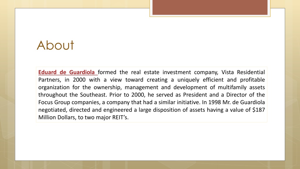 About Eduard de Guardiolaformed the real estate investment company, Vista Residential Partners, in 2000 with a view toward creating a uniquely efficient and profitable organization for the ownership, management and development of multifamily assets throughout the Southeast. Prior to 2000, he served as President and a Director of the Focus Group companies, a company that had a similar initiative. In 1998 Mr. de Guardiola negotiated, directed and engineered a large disposition of assets having a value of $187 Million Dollars, to two major REIT’s.