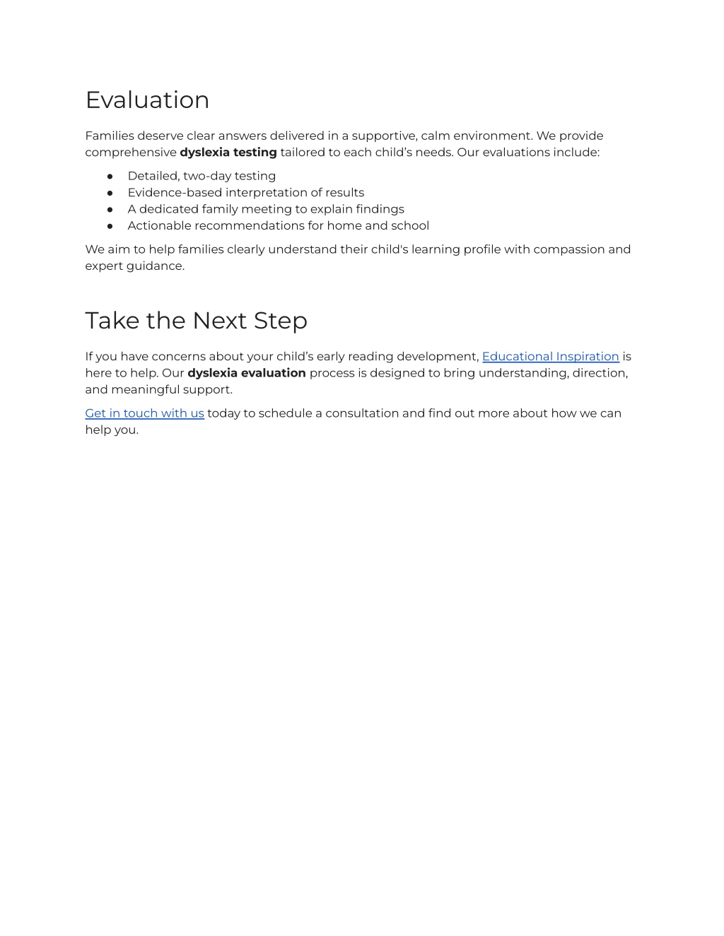 3. Evaluation Families deserve clear answers delivered in a supportive, calm environment. We provide comprehensive dyslexia testing tailored to each child’s needs. Our evaluations include: Detailed, two-day testing Evidence-based interpretation of results A dedicated family meeting to explain findings Actionable recommendations for home and school ● ● ● ● We aim to help families clearly understand their child's learning profile with compassion and expert guidance. Take the Next Step If you have concerns about your child’s early reading development, Educational Inspiration is here to help. Our dyslexia evaluation process is designed to bring understanding, direction, and meaningful support. Get in touch with us today to schedule a consultation and find out more about how we can help you.