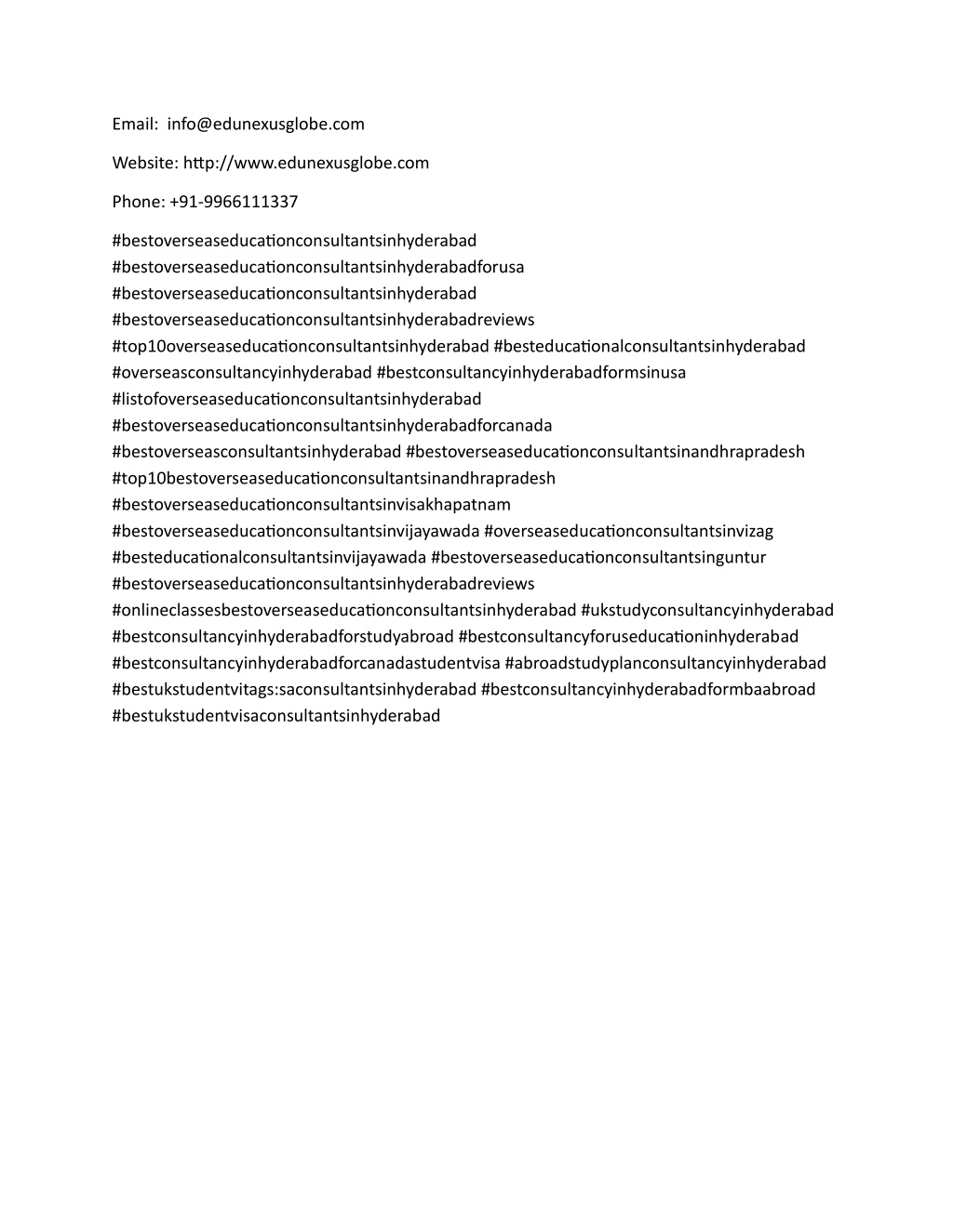 Email: info@edunexusglobe.com Website: http://www.edunexusglobe.com Phone: +91-9966111337 #bestoverseaseducationconsultantsinhyderabad #bestoverseaseducationconsultantsinhyderabadforusa #bestoverseaseducationconsultantsinhyderabad #bestoverseaseducationconsultantsinhyderabadreviews #top10overseaseducationconsultantsinhyderabad #besteducationalconsultantsinhyderabad #overseasconsultancyinhyderabad #bestconsultancyinhyderabadformsinusa #listofoverseaseducationconsultantsinhyderabad #bestoverseaseducationconsultantsinhyderabadforcanada #bestoverseasconsultantsinhyderabad #bestoverseaseducationconsultantsinandhrapradesh #top10bestoverseaseducationconsultantsinandhrapradesh #bestoverseaseducationconsultantsinvisakhapatnam #bestoverseaseducationconsultantsinvijayawada #overseaseducationconsultantsinvizag #besteducationalconsultantsinvijayawada #bestoverseaseducationconsultantsinguntur #bestoverseaseducationconsultantsinhyderabadreviews #onlineclassesbestoverseaseducationconsultantsinhyderabad #ukstudyconsultancyinhyderabad #bestconsultancyinhyderabadforstudyabroad #bestconsultancyforuseducationinhyderabad #bestconsultancyinhyderabadforcanadastudentvisa #abroadstudyplanconsultancyinhyderabad #bestukstudentvitags:saconsultantsinhyderabad #bestconsultancyinhyderabadformbaabroad #bestukstudentvisaconsultantsinhyderabad