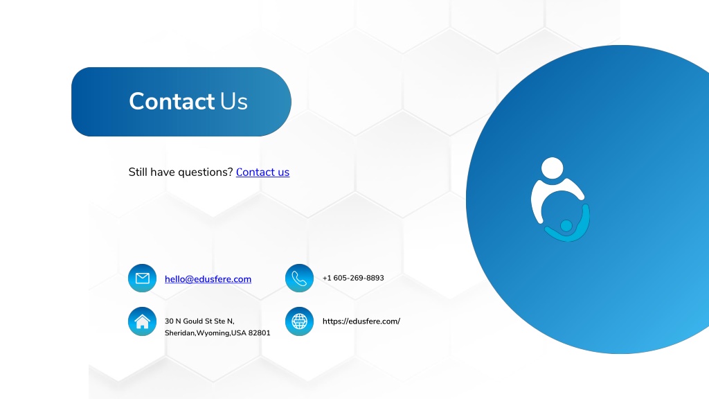 Contact Us Still have questions? Сontact us hello@edusfere.com +1 605-269-8893 https://edusfere.com/ 30 N Gould St Ste N, Sheridan,Wyoming,USA 82801