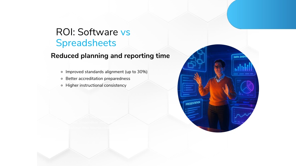 ROI: Software vs Spreadsheets Reduced planning and reporting time • Improved standards alignment (up to 30%) • Better accreditation preparedness • Higher instructional consistency Lorem ipsum dolor sit amet, consectetur adipiscing elit. Suspendisse viverra felis nisl, sed pulvinar risus lobortis vitae.