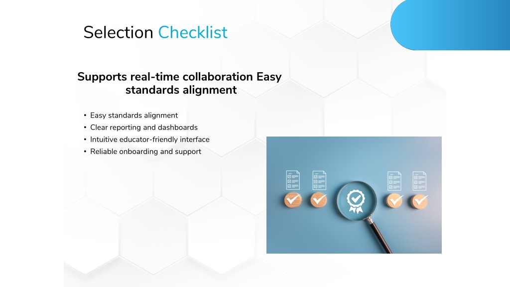 Selection Checklist Supports real-time collaboration Easy standards alignment • Easy standards alignment • Clear reporting and dashboards • Intuitive educator-friendly interface • Reliable onboarding and support