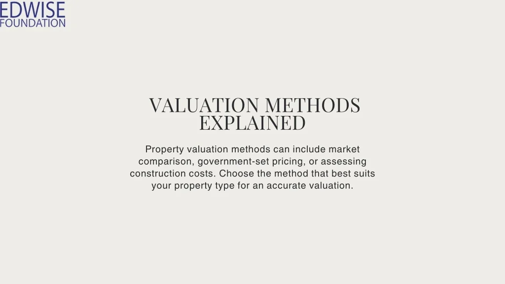 VALUATION METHODS EXPLAINED Property valuation methods can include market comparison, government-set pricing, or assessing construction costs. Choose the method that best suits your property type for an accurate valuation.