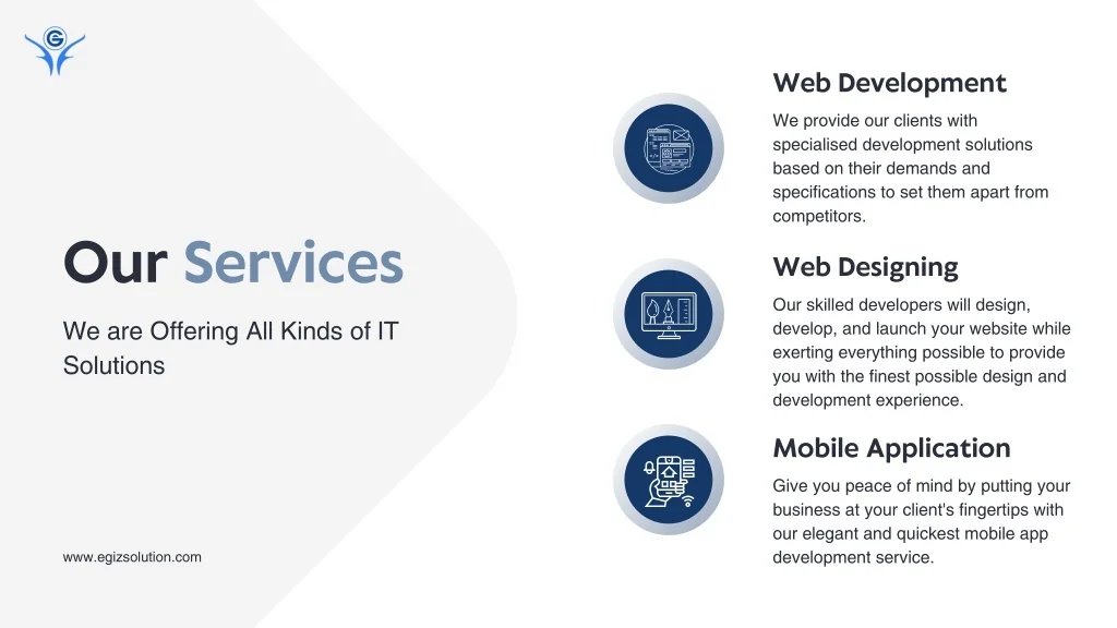 Web Development We provide our clients with specialised development solutions based on their demands and specifications to set them apart from competitors. Our Services Web Designing Our skilled developers will design, develop, and launch your website while exerting everything possible to provide you with the finest possible design and development experience. We are Offering All Kinds of IT Solutions Mobile Application Give you peace of mind by putting your business at your client's fingertips with our elegant and quickest mobile app development service. www.egizsolution.com
