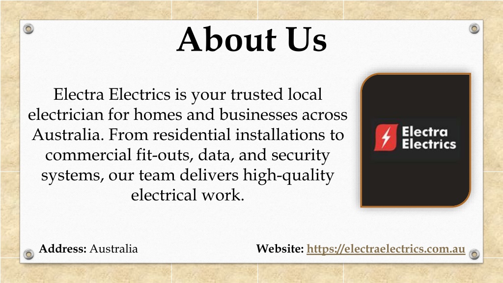 About Us Electra Electrics is your trusted local electrician for homes and businesses across Australia. From residential installations to commercial fit-outs, data, and security systems, our team delivers high-quality electrical work. Address: Australia Website: https://electraelectrics.com.au
