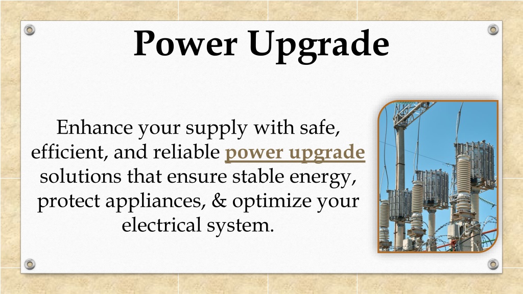 Power Upgrade Enhance your supply with safe, efficient, and reliablepower upgradesolutions that ensure stable energy, protect appliances, & optimize your electrical system.