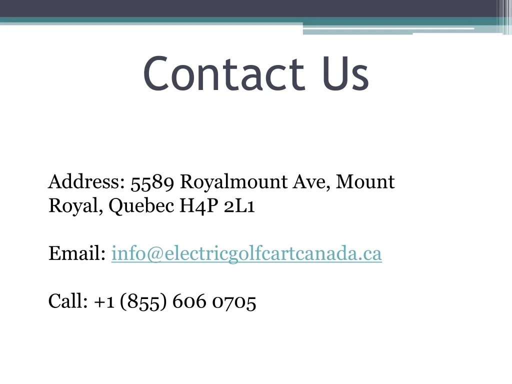 Contact Us Address: 5589 Royalmount Ave, Mount Royal, Quebec H4P 2L1 Email: info@electricgolfcartcanada.ca Call: +1 (855) 606 0705