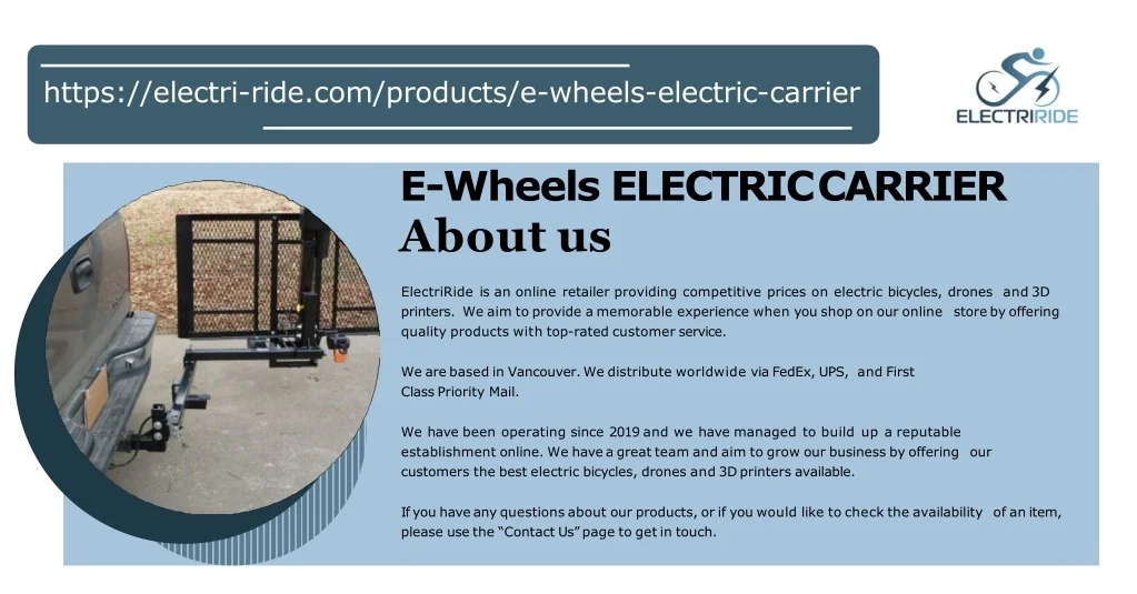 https://electri-ride.com/products/e-wheels-electric-carrier E-Wheels ELECTRICCARRIER About us ElectriRide is an online retailer providing competitive prices on electric bicycles, drones and 3D printers. We aim to provide a memorable experience when you shop on our online store by offering quality products with top-rated customer service. We are based in Vancouver.We distribute worldwide via FedEx, UPS, and First Class Priority Mail. We have been operating since 2019 and we have managed to build up a reputable establishment online. We havea great team and aim to grow our business by offering our customers the best electric bicycles, drones and 3Dprinters available. Ifyou haveany questions about our products, or if you would like to check the availability of an item, please use the “Contact Us”page to get in touch.