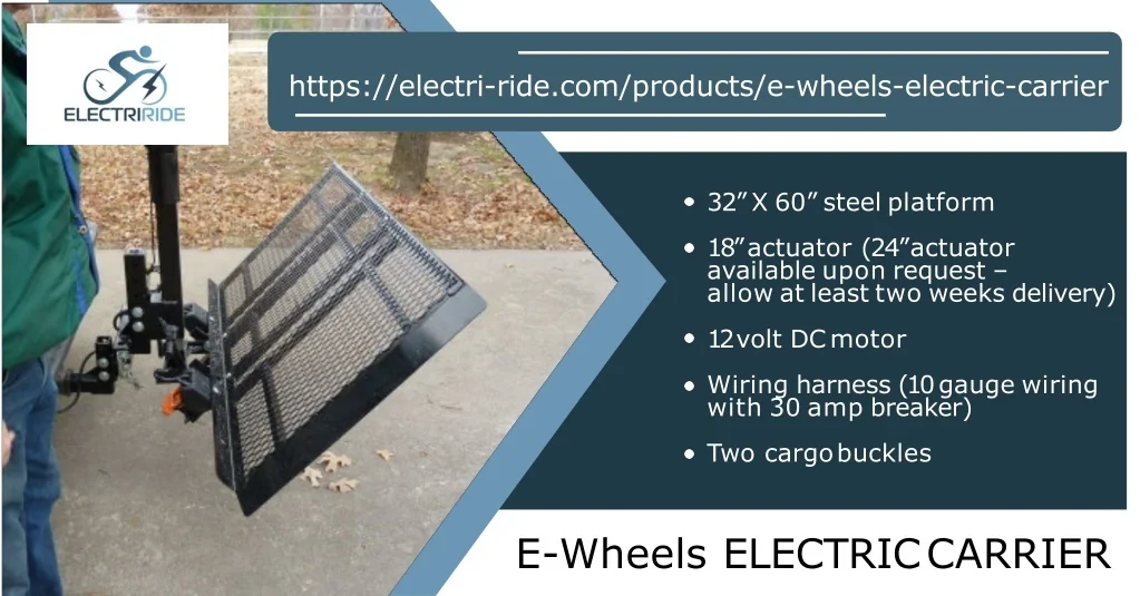 https://electri-ride.com/products/e-wheels-electric-carrier 32”X 60” steel platform 18” actuator (24”actuator available upon request – allow at least two weeks delivery) 12 volt DCmotor Wiring harness (10gauge wiring with 30 amp breaker) Two cargobuckles E-Wheels ELECTRICCARRIER