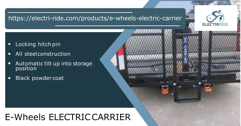https://electri-ride.com/products/e-wheels-electric-carrier Locking hitchpin All steelconstruction Automatic tilt up into storage position Black powdercoat E-Wheels ELECTRICCARRIER
