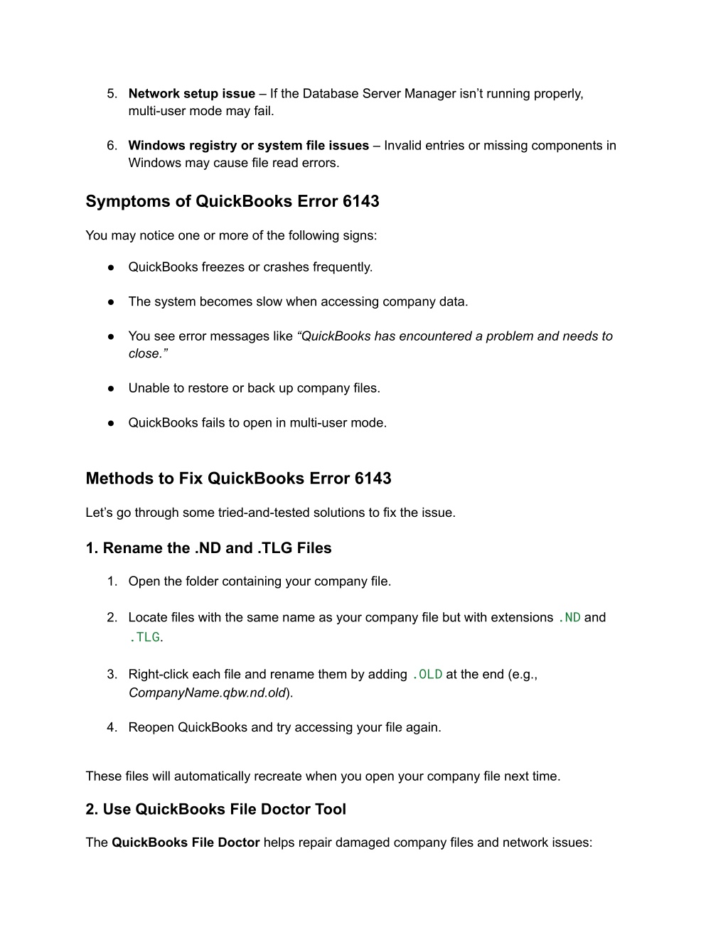 2. 5. Network setup issue – If the Database Server Manager isn’t running properly, multi-user mode may fail. 6. Windows registry or system file issues – Invalid entries or missing components in Windows may cause file read errors. Symptoms of QuickBooks Error 6143 You may notice one or more of the following signs: ● QuickBooks freezes or crashes frequently. ● The system becomes slow when accessing company data. ● You see error messages like “QuickBooks has encountered a problem and needs to close.” ● Unable to restore or back up company files. ● QuickBooks fails to open in multi-user mode. Methods to Fix QuickBooks Error 6143 Let’s go through some tried-and-tested solutions to fix the issue. 1. Rename the .ND and .TLG Files 1. Open the folder containing your company file. 2. Locate files with the same name as your company file but with extensions .ND and .TLG. 3. Right-click each file and rename them by adding .OLD at the end (e.g., CompanyName.qbw.nd.old). 4. Reopen QuickBooks and try accessing your file again. These files will automatically recreate when you open your company file next time. 2. Use QuickBooks File Doctor Tool The QuickBooks File Doctor helps repair damaged company files and network issues: