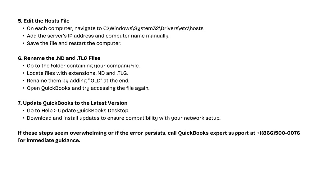 5. Edit the Hosts File • On each computer, navigate to C:\Windows\System32\Drivers\etc\hosts. • Add the server’s IP address and computer name manually. • Save the file and restart the computer. • 6. Rename the .ND and .TLG Files • Go to the folder containing your company file. • Locatefiles with extensions .ND and .TLG. • Rename them by adding “.OLD” at the end. • Open QuickBooks and try accessing the file again. • 7. Update QuickBooks to the Latest Version • Go to Help > Update QuickBooks Desktop. • Download and install updates to ensure compatibility with your network setup. • If these steps seem overwhelming or if the error persists, call QuickBooks expert support at +1(866)500-0076 for immediate guidance.