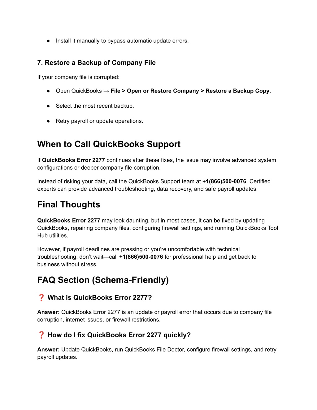 ● Install it manually to bypass automatic update errors. 7. Restore a Backup of Company File If your company file is corrupted: ● Open QuickBooks → File > Open or Restore Company > Restore a Backup Copy. ● Select the most recent backup. ● Retry payroll or update operations. When to Call QuickBooks Support If QuickBooks Error 2277 continues after these fixes, the issue may involve advanced system configurations or deeper company file corruption. Instead of risking your data, call the QuickBooks Support team at +1(866)500-0076. Certified experts can provide advanced troubleshooting, data recovery, and safe payroll updates. Final Thoughts QuickBooks Error 2277 may look daunting, but in most cases, it can be fixed by updating QuickBooks, repairing company files, configuring firewall settings, and running QuickBooks Tool Hub utilities. However, if payroll deadlines are pressing or you’re uncomfortable with technical troubleshooting, don’t wait—call +1(866)500-0076 for professional help and get back to business without stress. FAQ Section (Schema-Friendly) ❓ What is QuickBooks Error 2277? Answer: QuickBooks Error 2277 is an update or payroll error that occurs due to company file corruption, internet issues, or firewall restrictions. ❓ How do I fix QuickBooks Error 2277 quickly? Answer: Update QuickBooks, run QuickBooks File Doctor, configure firewall settings, and retry payroll updates.