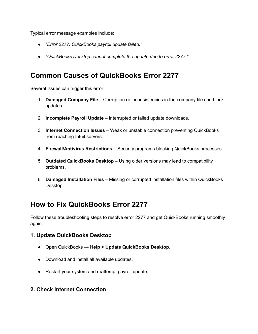 Typical error message examples include: ● “Error 2277: QuickBooks payroll update failed.” ● “QuickBooks Desktop cannot complete the update due to error 2277.” Common Causes of QuickBooks Error 2277 Several issues can trigger this error: 1. Damaged Company File – Corruption or inconsistencies in the company file can block updates. 2. Incomplete Payroll Update – Interrupted or failed update downloads. 3. Internet Connection Issues – Weak or unstable connection preventing QuickBooks from reaching Intuit servers. 4. Firewall/Antivirus Restrictions – Security programs blocking QuickBooks processes. 5. Outdated QuickBooks Desktop – Using older versions may lead to compatibility problems. 6. Damaged Installation Files – Missing or corrupted installation files within QuickBooks Desktop. How to Fix QuickBooks Error 2277 Follow these troubleshooting steps to resolve error 2277 and get QuickBooks running smoothly again. 1. Update QuickBooks Desktop ● Open QuickBooks → Help > Update QuickBooks Desktop. ● Download and install all available updates. ● Restart your system and reattempt payroll update. 2. Check Internet Connection