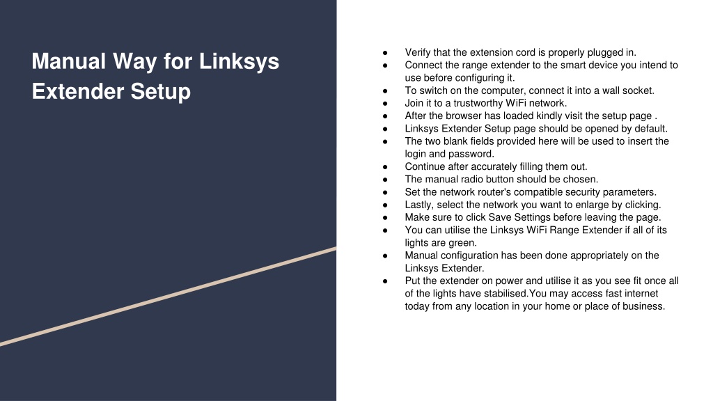 Manual Way for Linksys Extender Setup • Verify that the extension cord is properly plugged in. • Connect the range extender to the smart device you intend to use before configuring it. • To switch on the computer, connect it into a wall socket. • Join it to a trustworthy WiFi network. • After the browser has loaded kindly visit the setup page . • Linksys Extender Setup page should be opened by default. • The two blank fields provided here will be used to insert the login and password. • Continue after accurately filling them out. • The manual radio button should be chosen. • Set the network router's compatible security parameters. • Lastly, select the network you want to enlarge by clicking. • Make sure to click Save Settings before leaving the page. • You can utilise the Linksys WiFi Range Extender if all of its lights are green. • Manual configuration has been done appropriately on the Linksys Extender. • Put the extender on power and utilise it as you see fit once all of the lights have stabilised.You may access fast internet today from any location in your home or place of business.