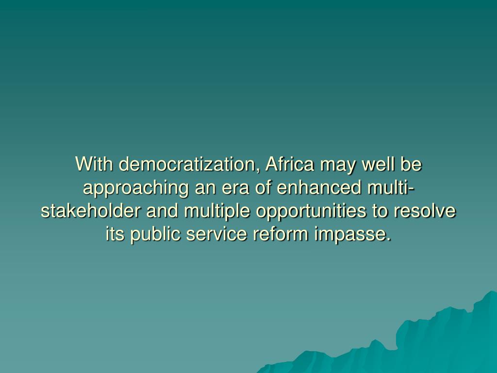 With democratization, Africa may well be approaching an era of enhanced multi-stakeholder and multiple opportunities to resolve its public service reform impasse.