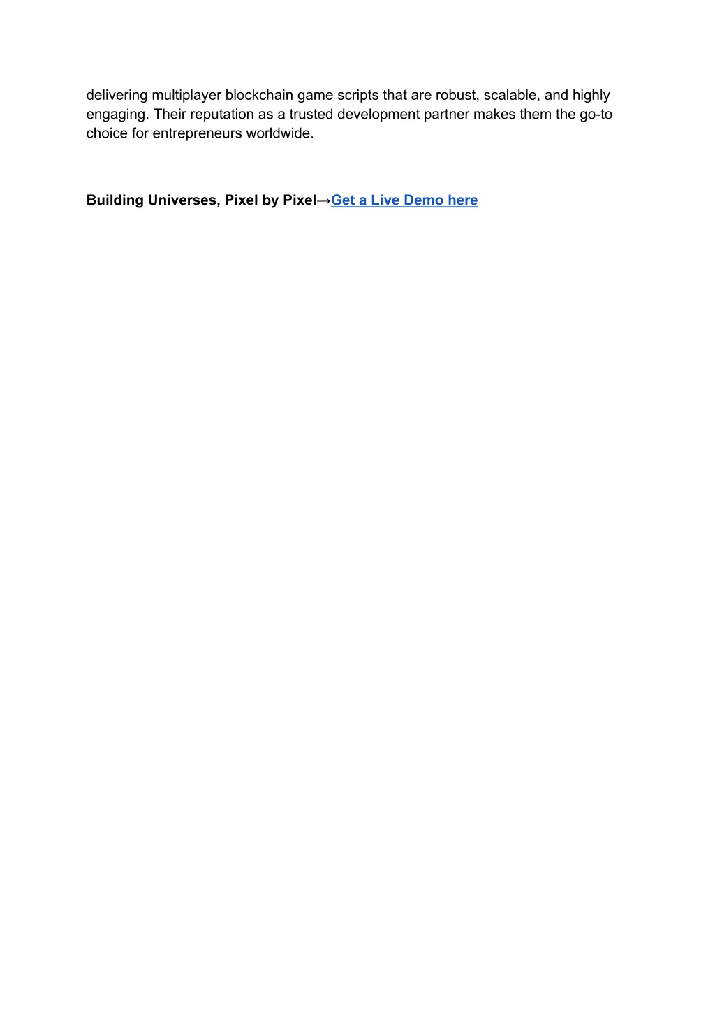 delivering multiplayer blockchain game scripts that are robust, scalable, and highly engaging. Their reputation as a trusted development partner makes them the go-to choice for entrepreneurs worldwide. Building Universes, Pixel by Pixel→Get a Live Demo here