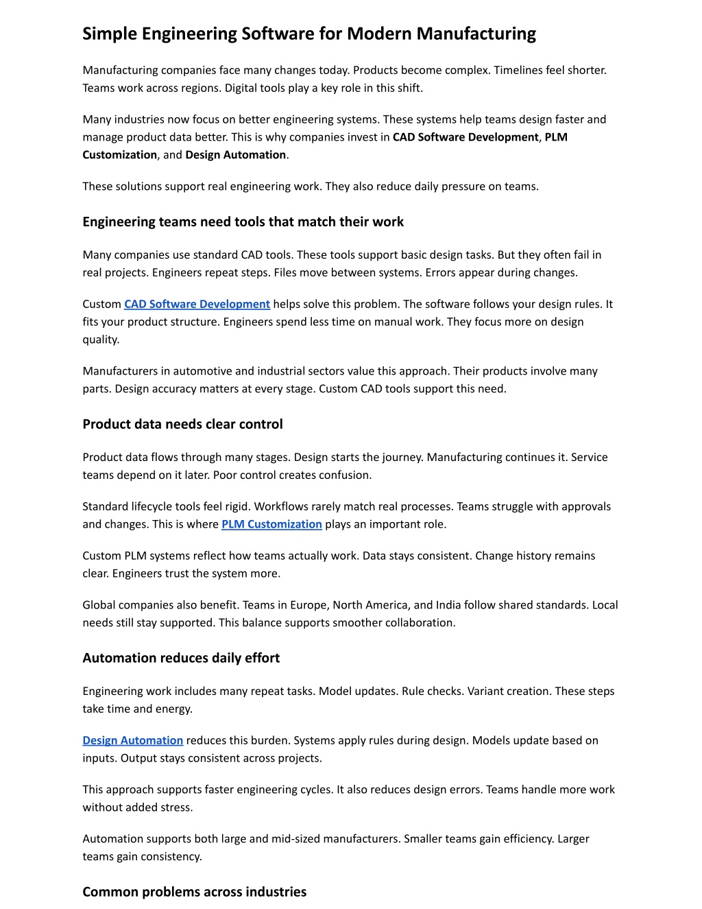 Simple Engineering Software for Modern Manufacturing Manufacturing companies face many changes today. Products become complex. Timelines feel shorter. Teams work across regions. Digital tools play a key role in this shift. Many industries now focus on better engineering systems. These systems help teams design faster and manage product data better. This is why companies invest in CAD Software Development, PLM Customization, and Design Automation. These solutions support real engineering work. They also reduce daily pressure on teams. Engineering teams need tools that match their work Many companies use standard CAD tools. These tools support basic design tasks. But they often fail in real projects. Engineers repeat steps. Files move between systems. Errors appear during changes. Custom CAD Software Development helps solve this problem. The software follows your design rules. It fits your product structure. Engineers spend less time on manual work. They focus more on design quality. Manufacturers in automotive and industrial sectors value this approach. Their products involve many parts. Design accuracy matters at every stage. Custom CAD tools support this need. Product data needs clear control Product data flows through many stages. Design starts the journey. Manufacturing continues it. Service teams depend on it later. Poor control creates confusion. Standard lifecycle tools feel rigid. Workflows rarely match real processes. Teams struggle with approvals and changes. This is where PLM Customization plays an important role. Custom PLM systems reflect how teams actually work. Data stays consistent. Change history remains clear. Engineers trust the system more. Global companies also benefit. Teams in Europe, North America, and India follow shared standards. Local needs still stay supported. This balance supports smoother collaboration. Automation reduces daily effort Engineering work includes many repeat tasks. Model updates. Rule checks. Variant creation. These steps take time and energy. Design Automation reduces this burden. Systems apply rules during design. Models update based on inputs. Output stays consistent across projects. This approach supports faster engineering cycles. It also reduces design errors. Teams handle more work without added stress. Automation supports both large and mid-sized manufacturers. Smaller teams gain efficiency. Larger teams gain consistency. Common problems across industries